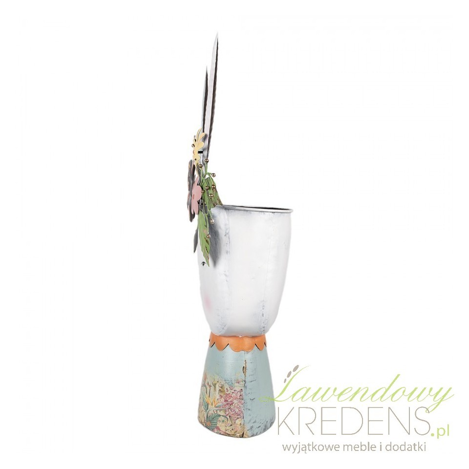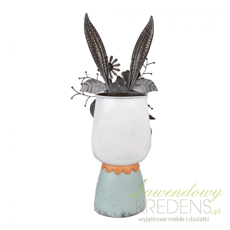 To figurka dekoracyjna, nie klasyczna donica/osłonka. Nie traktuj jej jako naczynia do sadzenia z odpływem – jeśli chcesz efekt roślinny, ustaw obok donicę lub kosz i zbuduj kompozycję warstwami.Jak czyścić i konserwować metalowego zająca, żeby nie tracił patyny?