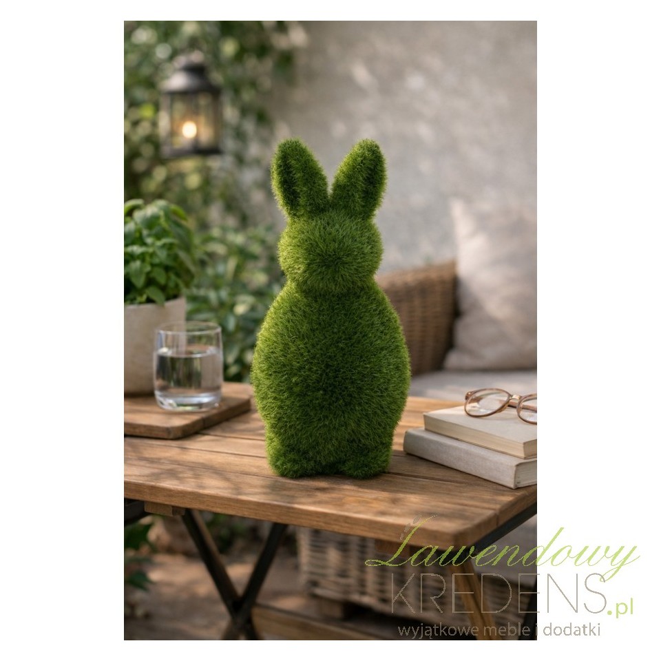 Ta figurka wygląda jak miniaturowe topiary: miękka, „trawiasta” tekstura daje efekt ręcznie dopracowanej powierzchni, a prosta sylwetka z długimi uszami wprowadza porządek wizualny. Polecam zestawić ją z lnianym obrusem, ceramiką w kolorze ecru i drewnem z widocznym usłojeniem. W nowocześniejszych wnętrzach zagra z betonem architektonicznym i szkłem – jako kontrastowy, organiczny detal, który ociepla kompozycję.Stabilna dekoracja do domu, która nie wygląda „jarmarcznie” – rozwiązanie dla minimalistów