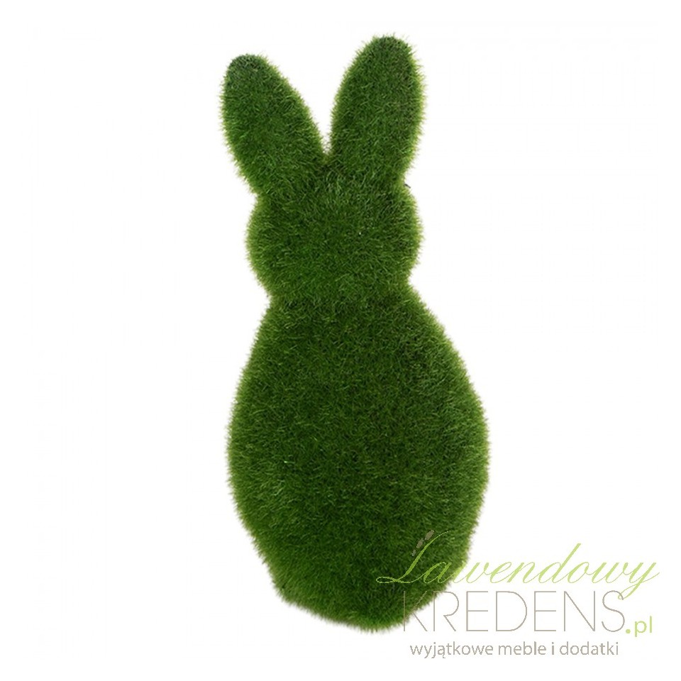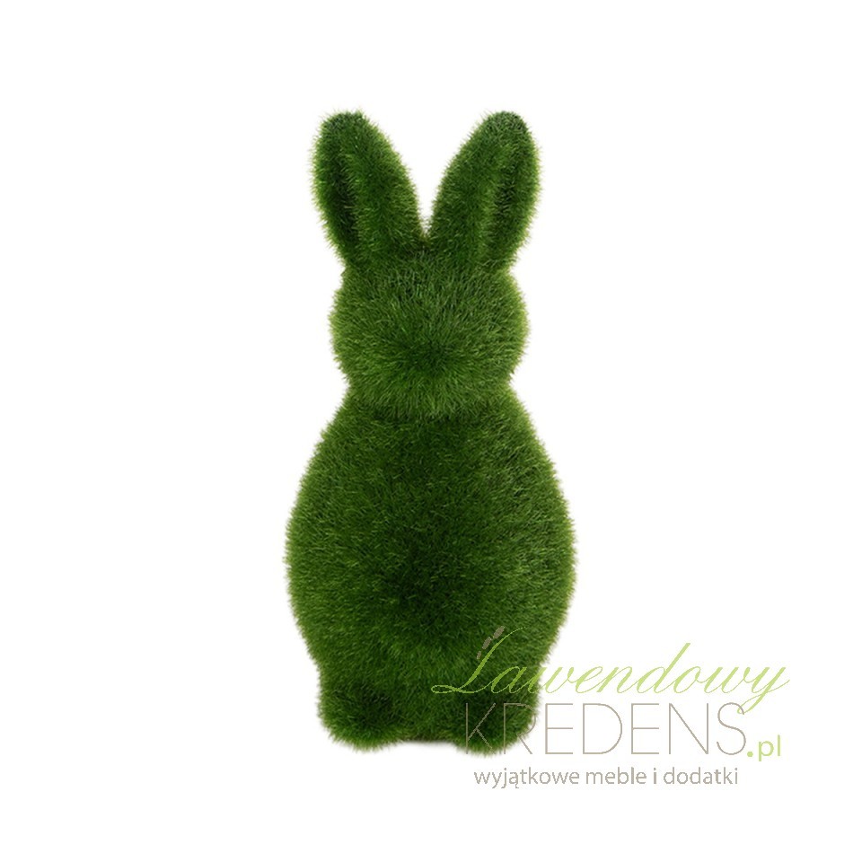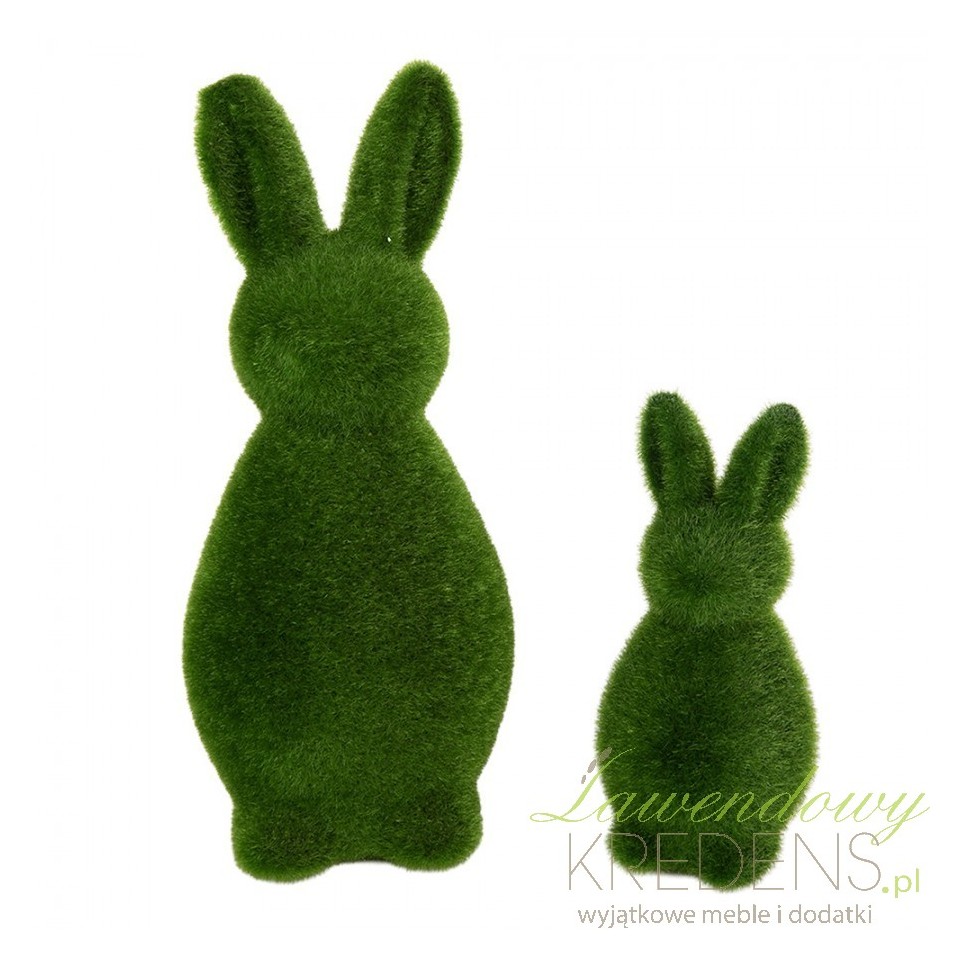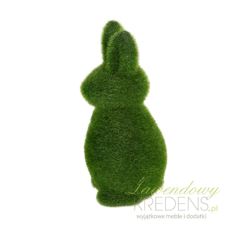 Ustaw zająca na tacy z mchem i dodaj kilka pisanek w matowym wykończeniu, aby uzyskać elegancki, „ogrodowy” klimat. Do wersji wieczornej dołóż mały lampion lub świecę w szkle – zieleń pięknie podbija ciepłe światło. W wiosennej witrynie sklepowej lub na recepcji sprawdza się jako centralny punkt ekspozycji, bo jest czytelny z daleka i nie wymaga dodatkowych dekoracji, by wyglądać profesjonalnie.Clayre & Eef: dekoracje w stylu vintage i cottage – jak dbać o efekt świeżej zieleni