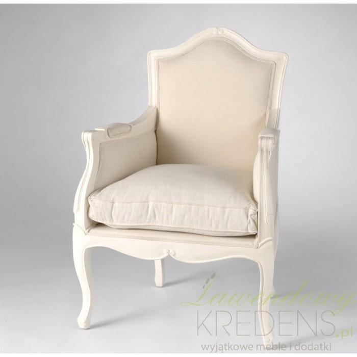Piękny fotel prowansalski ma stelaż w kolorze białym i jasnobeżową tapicerkę. Został wykonany z drewna i materiału.