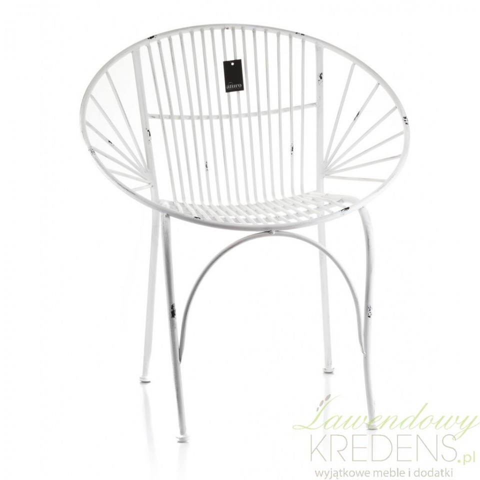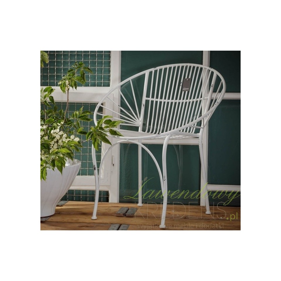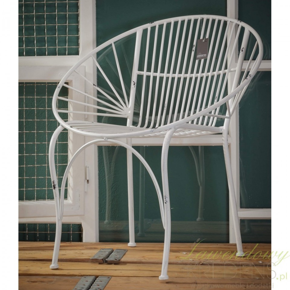 Stylowy fotel na metalowej ramie inspirowany prowansalskim wzornictwem i współczesnymi trendami. Wykonany z wysokiej jakości stopu metalu w delikatnym, białym odcieniu z licznymi odpryskami. Fotel z wygodnym siedziskiem i parciem z metalowych prętów opiera się na kształcie koła. Sprawdzi się w skandynawskich i francuskich kuchniach ale także na tarasie w komplecie z metalowym stołem.