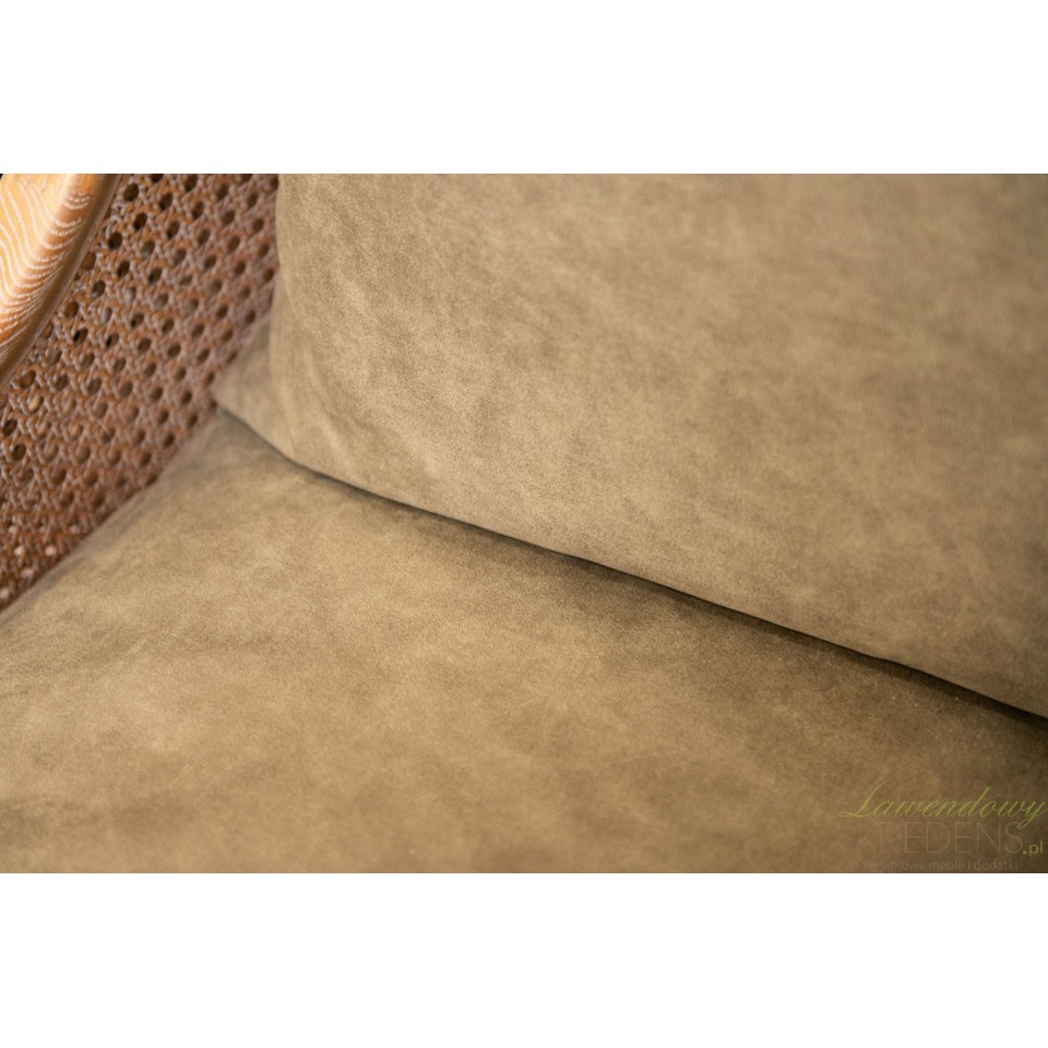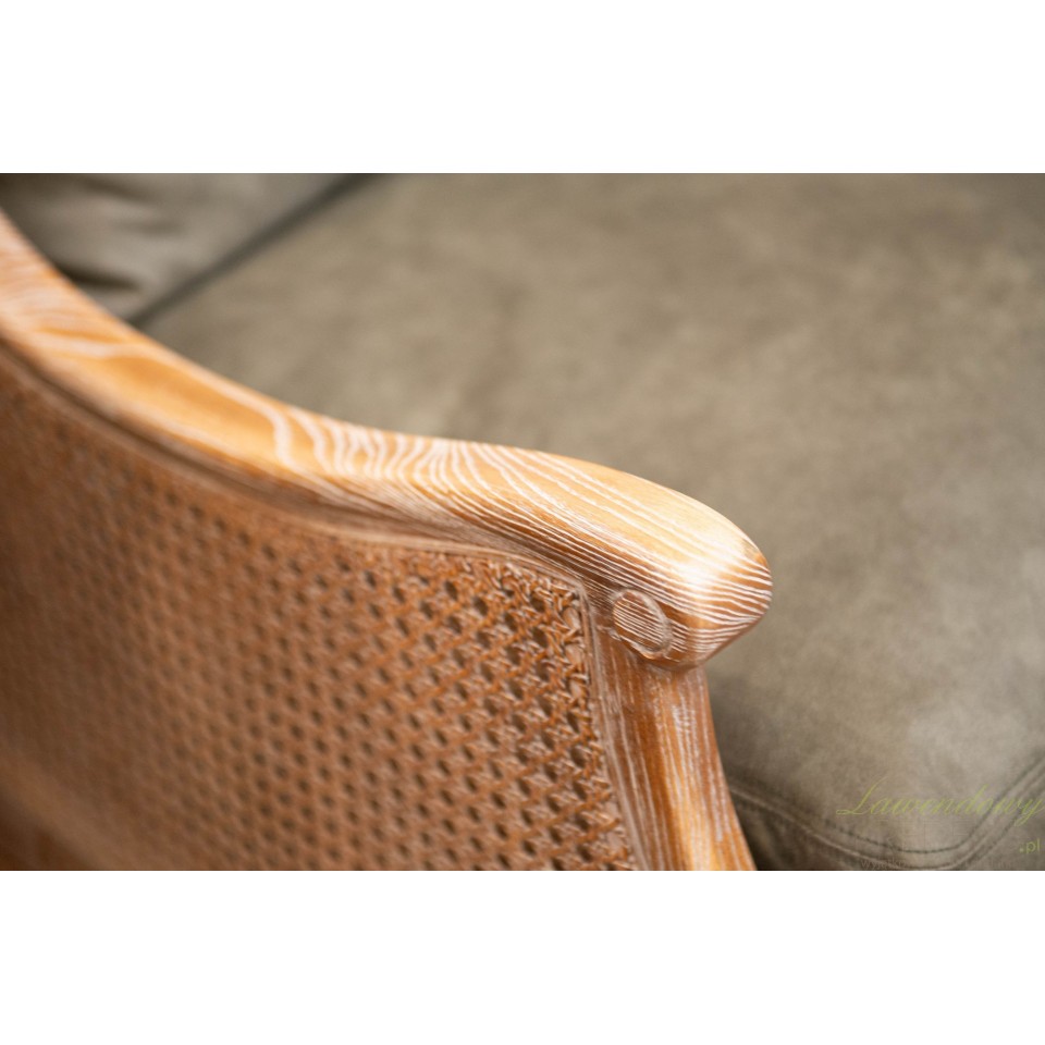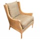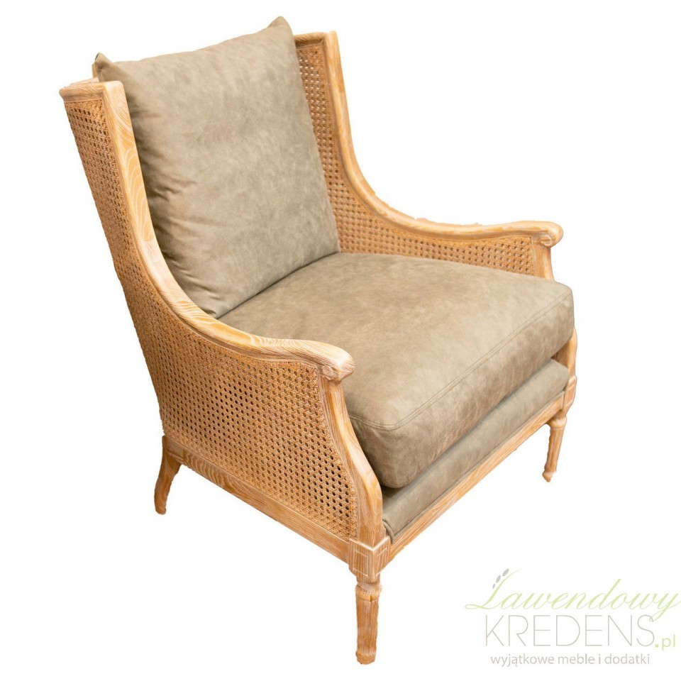 Swobodny i wygodny fotel w stylu prowansalskim ma rattanową ramę wykończoną w kolorze naturalnym z pluszowymi poduszkami, które zapewniają komfortowy odpoczynek.