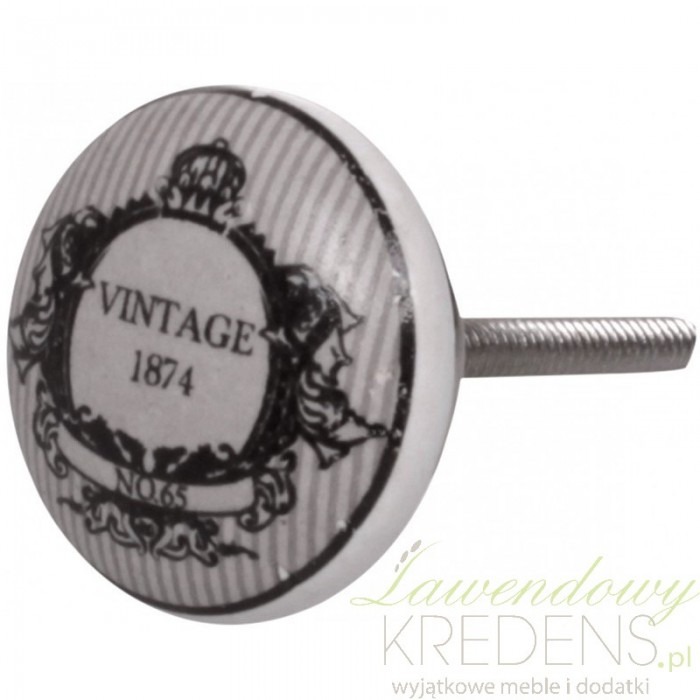 Mające okrągły, klasyczny profil, ozdobne gałki do mebli z grafiką herbu w centralnej części i napisami VINTAGE 1874 i NO. 65. Gałki do mebli w stylu vintage wyróżniają się ponadto kolorystyką, która łączy klasyczną czerń i biel z ciemnoszarymi , pionowymi paskami.