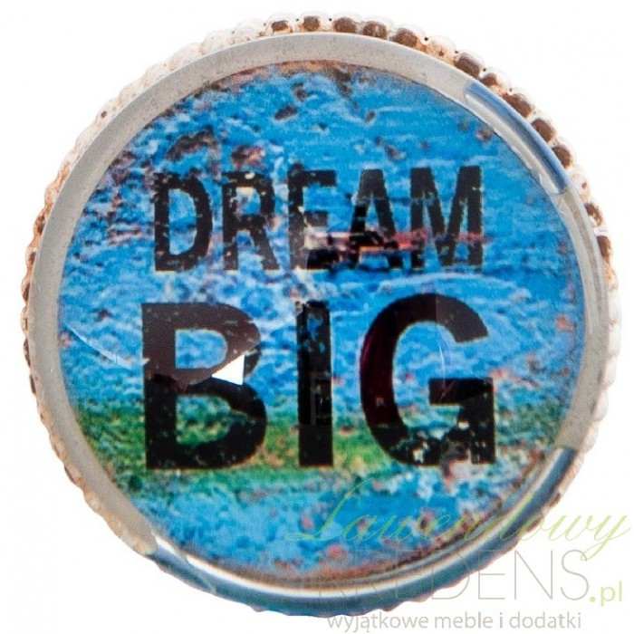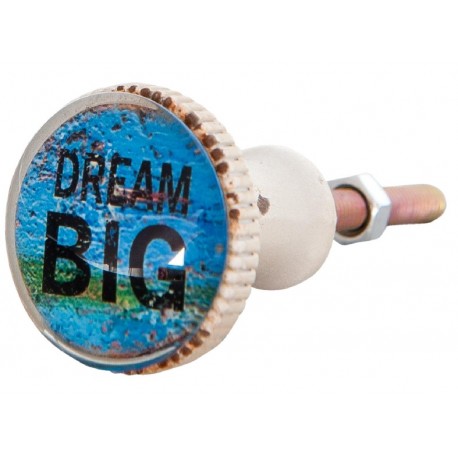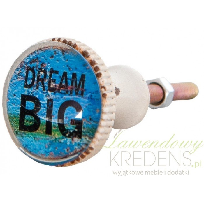 Te przykuwające uwagę gałki do mebli wykonane zostały z polirezynu. Uchwyty do mebli mają kolor niebieski z przetartą farbą, co sprawia że wyglądają na zniszczone. Gałki meblowe firmy Clayre & Eef na froncie mają duży angielski napis Dream Big. Idealne dla Ciebie!