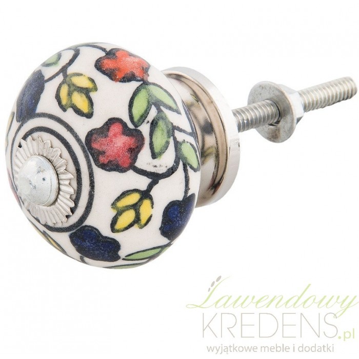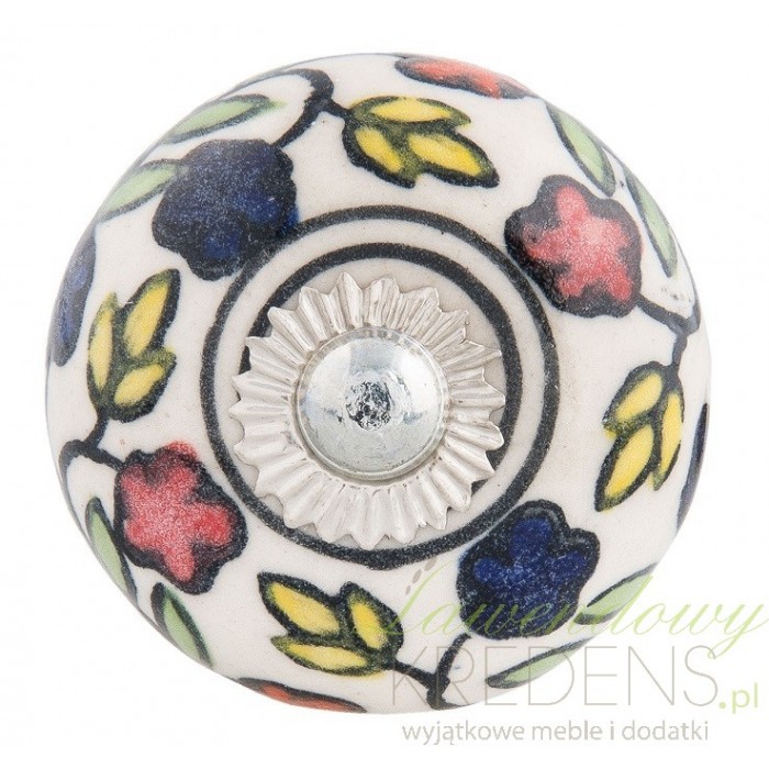 Okrągła gałka meblowa wykonana z białej ceramiki z ozdobnymi kwiatami w kolorach takich jak granat i czerwień. Gałki meblowe Clayre & Eef to dodatki dla każdego i na każdą kieszeń.