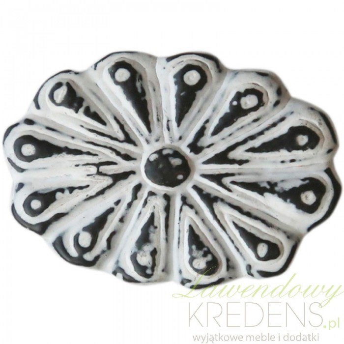 Gałka do mebli w kształcie owalnego kwiatuszka ma grafitowo-biały kolor. Wygląda na pierwszy rzut oka na stary model, ale to całkowicie nowa gałka przygotowana specjalnie dla Ciebie. Dwukolorowa gałka może zdobić różne meble od nowoczesnych po klasyczne. Ozdobne gałki do mebli od Chic Antique to kunszt antycznego stylu.