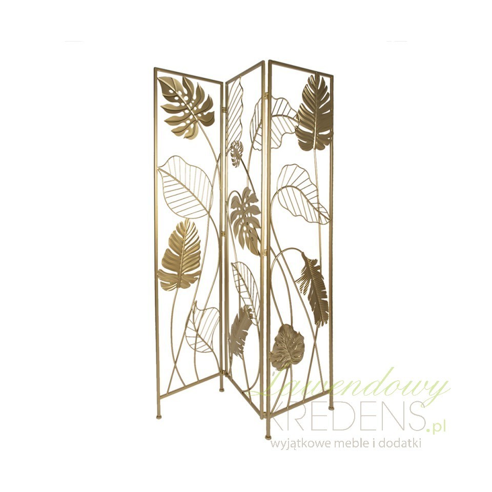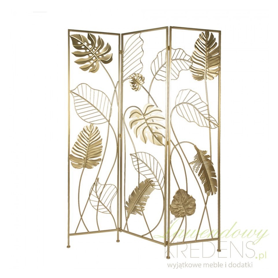 Główną cechą tego parawanu są trzy ażurowe skrzydła, z których każde jest misternie zdobione wzorem w liście palmy i paproci. Ta artystyczna interpretacja natury dodaje parawanowi wyjątkowego charakteru i sprawia, że każda przestrzeń zaczyna tętnić życiem. Delikatne, organiczne linie wzoru harmonijnie łączą się z nowoczesną formą, tworząc efektowne połączenie stylu glamour i skandynawskiego minimalizmu.