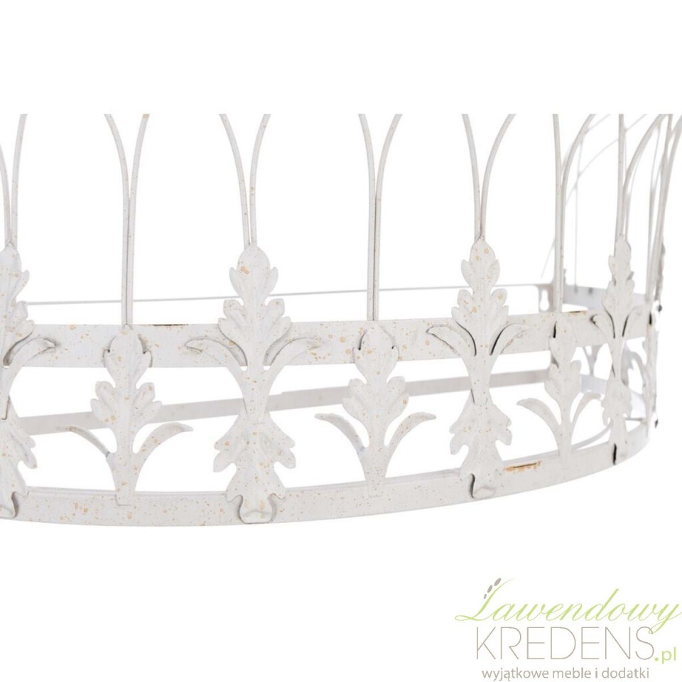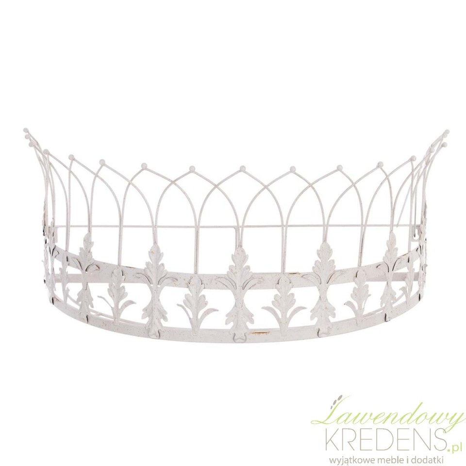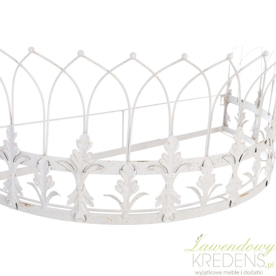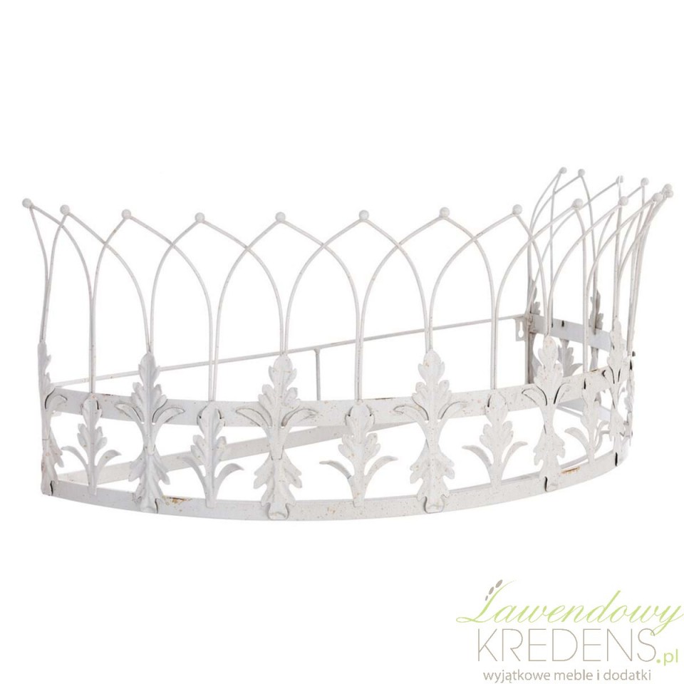 Ten stylowy stelaż o wymiarach 25 × 66 × 34 cm został wykonany z metalu w eleganckim, postarzanym białym kolorze. Jego dekoracyjne wykończenie przywodzi na myśl koronę lub ażurowe ogrodzenie z paryskich ogrodów – pełne romantyzmu, lekkości i prowansalskiego wdzięku. Delikatne łuki, rzeźbione liście oraz geometryczne przeploty tworzą misterną kompozycję, która wspaniale prezentuje się zarówno nad łóżkiem dziecięcym, jak i małżeńskim, a także w aranżacjach boho czy shabby chic.