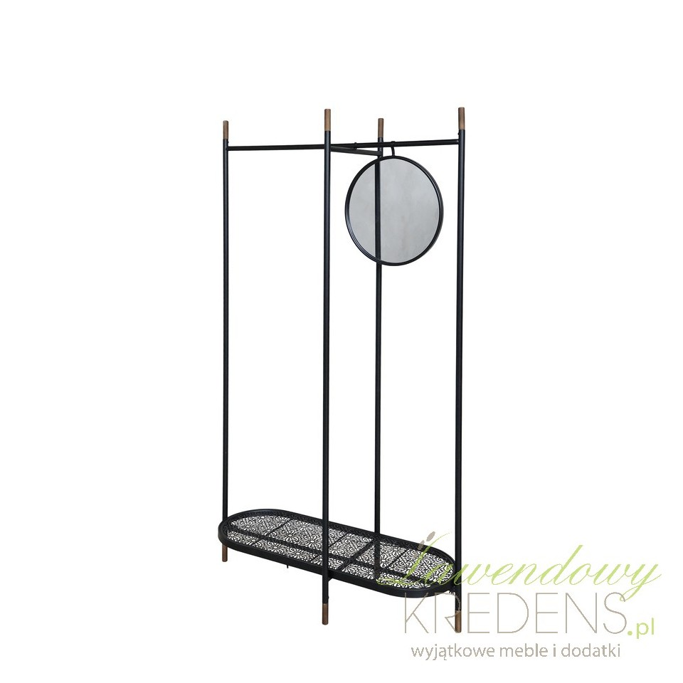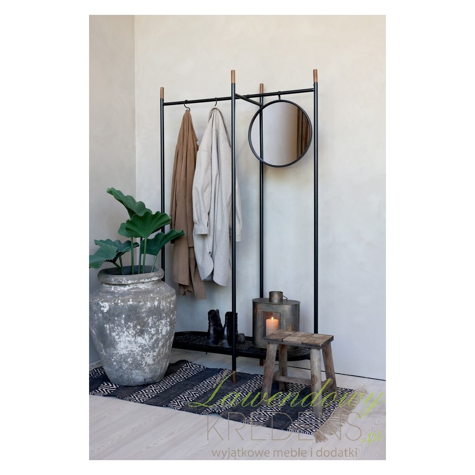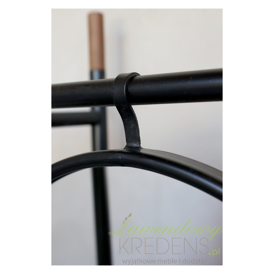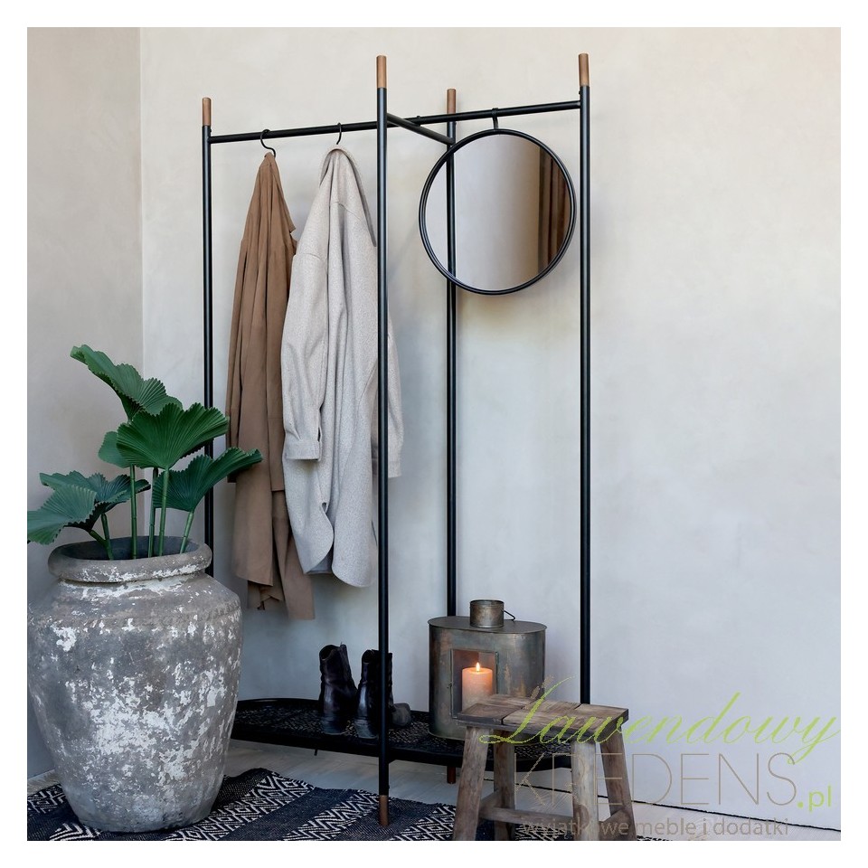 Wykonany w całości z metalu, wieszak ma wysokość 160 cm, szerokość 101 cm i głębokość 40 cm. Solidna, czarna konstrukcja nadaje mu charakterystyczny, surowy wygląd, który doskonale wpisuje się w modne, minimalistyczne aranżacje wnętrz. Centralnym punktem mebla jest wysokie, prostokątne lustro umieszczone w metalowej ramie – idealne do szybkiego sprawdzenia stylizacji przed wyjściem z domu. Lustro nie tylko pełni funkcję praktyczną, ale także optycznie powiększa przestrzeń, wprowadzając do niej więcej światła.