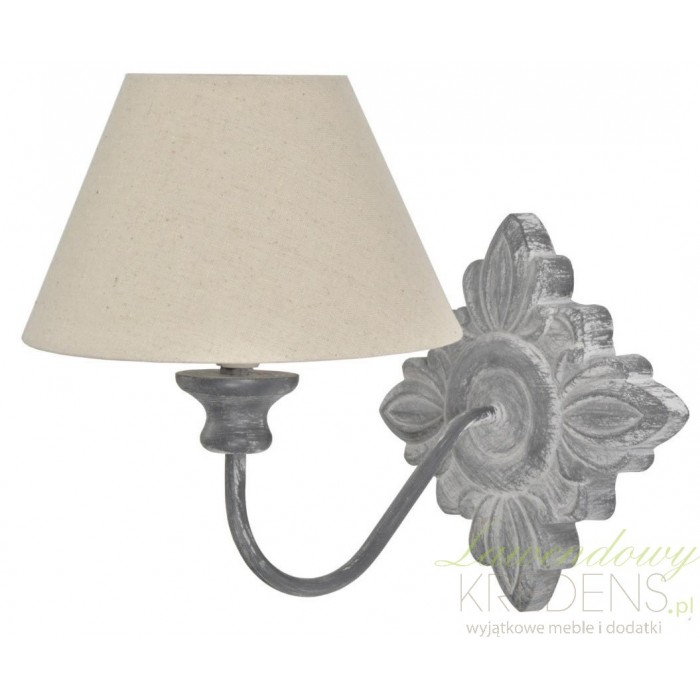 Oświetlenie prowansalskie to śliczne, mocno wyróżniające się swoją formą dodatki do wystroju wnętrz. Kinkiety w stylu prowansalskim wykonane są z drewna i metalu. Kinkiet prowansalski firmy Livin Hill ma szary kolor, a abażur jest w kolorze beżowym. Na łączeniu ze ścianą posiada cudowną ozdobę w formie kwiatka.