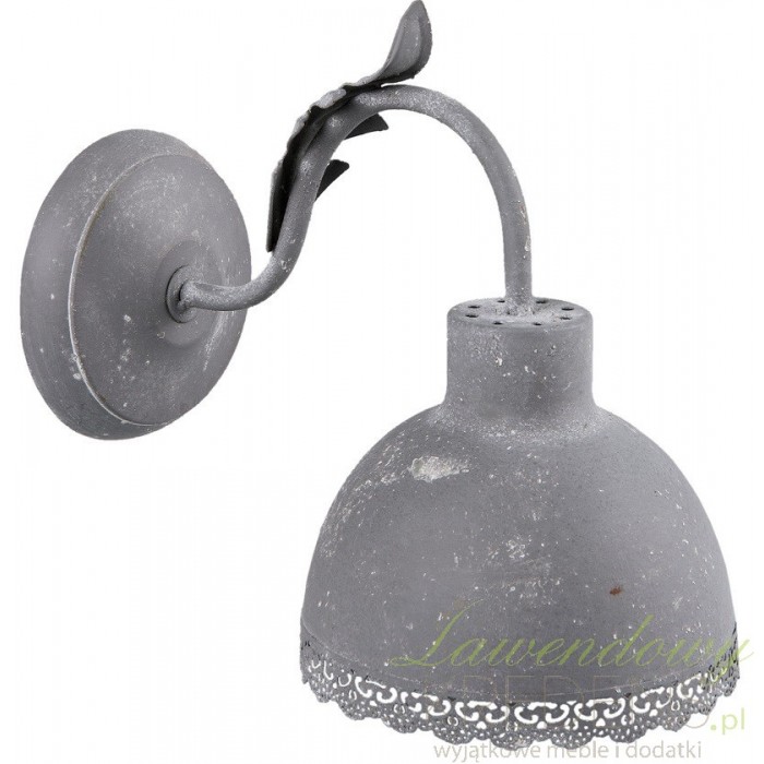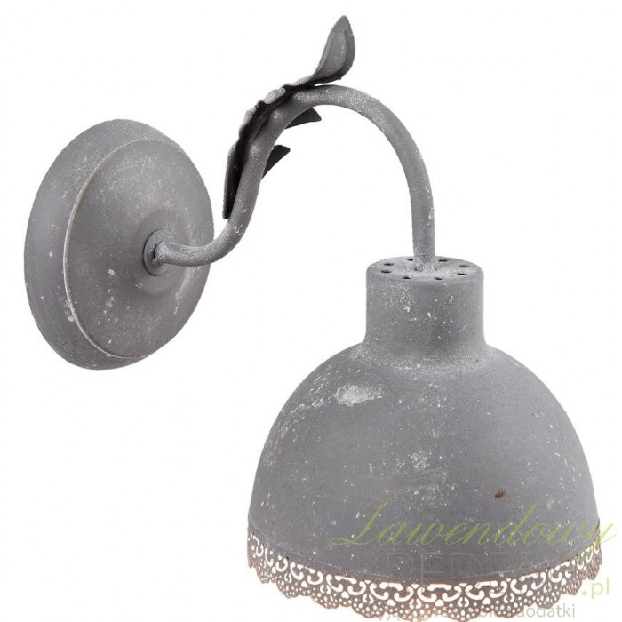 Szary kinkiet prowansalski został ozdobiony uroczym rzeźbieniem wokół dolnej krawędzi klosza i na uchwycie mocującym klosz.