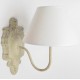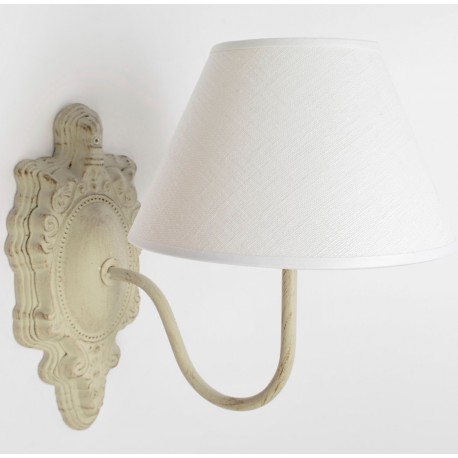 Kinkiet w stylu prowansalskim ma drewnianą podstawę mocujacą na ścianę. Podstawa kinkietu jest precyzyjnie wyrzeźbiona w owalnej płycie drewnianej. Ze środka podstawy wychodzi metalowy uchwyt z gwintem, na który nałożono biały abażur. Prosty abażur jest wykonany z lnu i ma kształt stożka. Kinkiety prowansalskie to kunszt pracy ekspertów od klimatycznego stylu prowansalskiego.