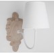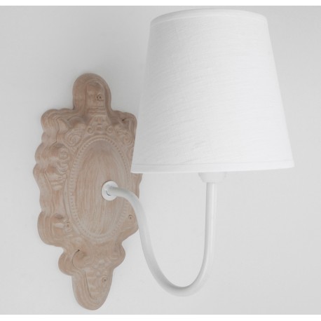 Elegancki kinkiet w stylu prowansalskim wykonano z drewna w kolorze jasnobrązowym i z białego materiału.
