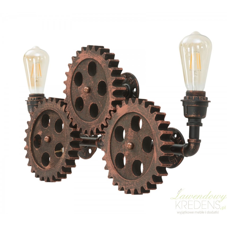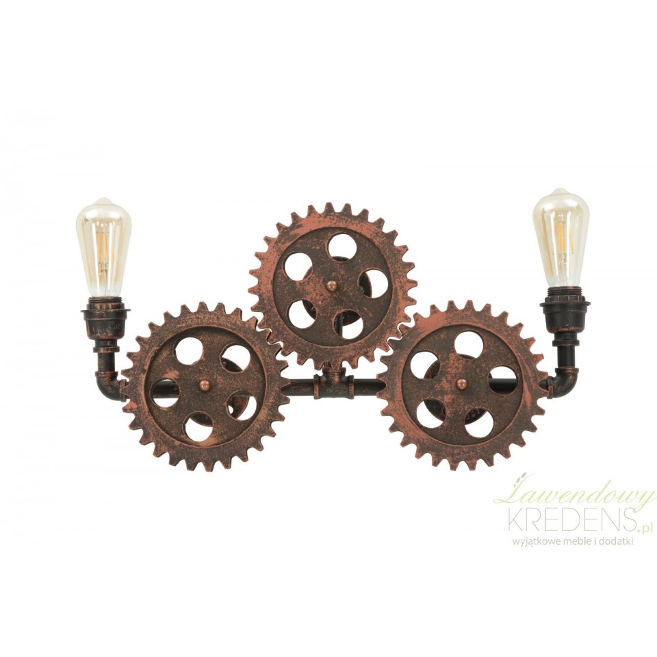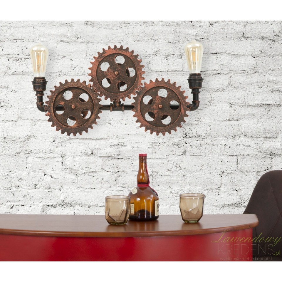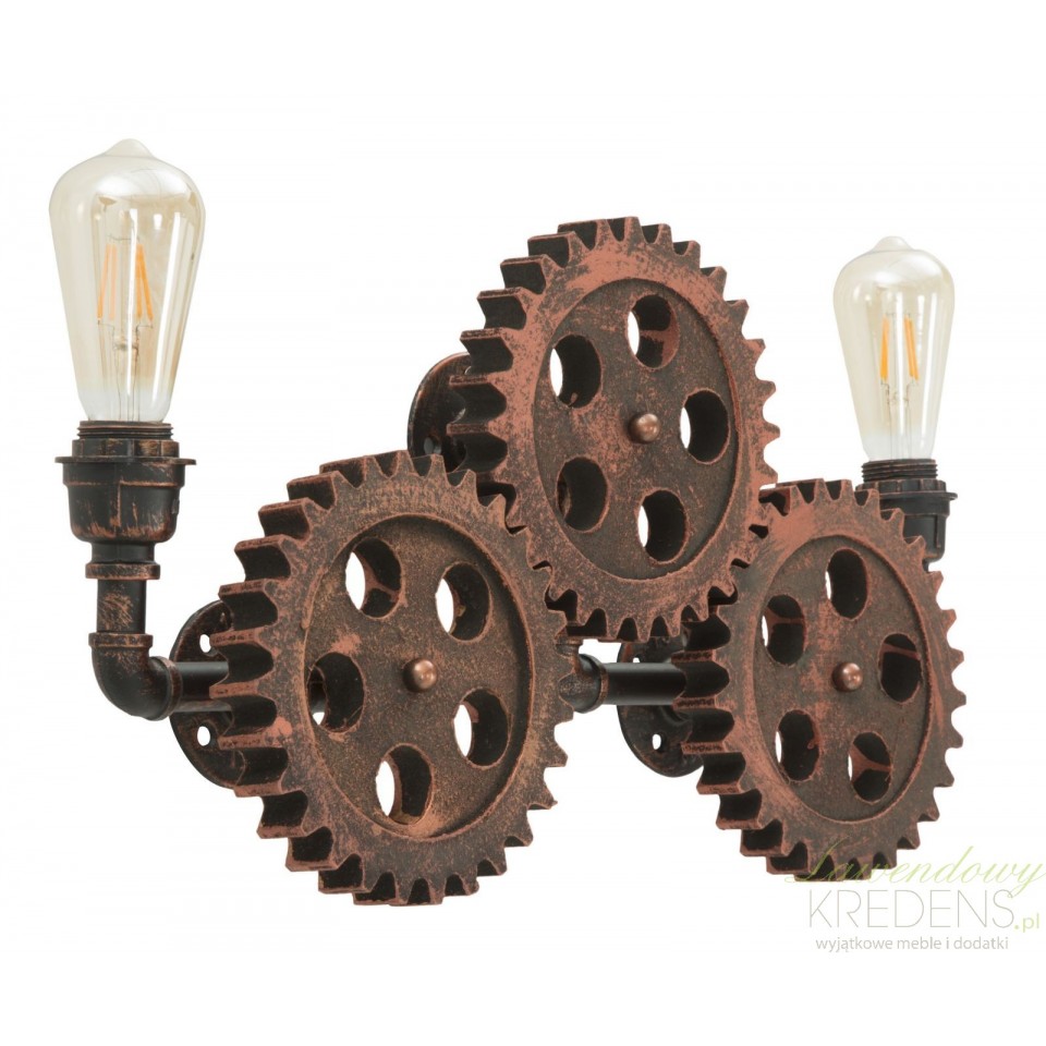Kinkiet w stylu industrialnym, który widzisz na zdjęciu to model zainspirowany kształtem koła zębatego, a właściwie trzech kół. Zazębiające się koła mają kolor rdzy i posiadają specjalne otwory służące do zamontowania lampy na ścianie. Industrialny kinkiet wyposażony jest w dwa źródła światła, którymi są charakterystyczne, podłużne żarówki skierowane ku górze. Kreatywne, metalowe kinkiety w stylu industrialnym znajdziesz w ofercie marki Mauro Ferretti.