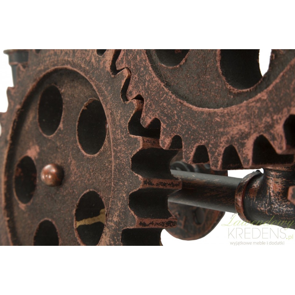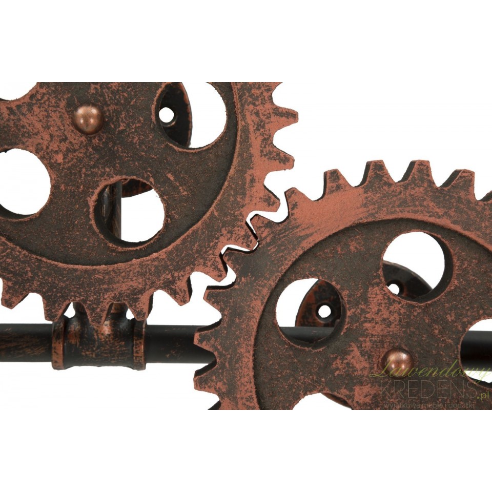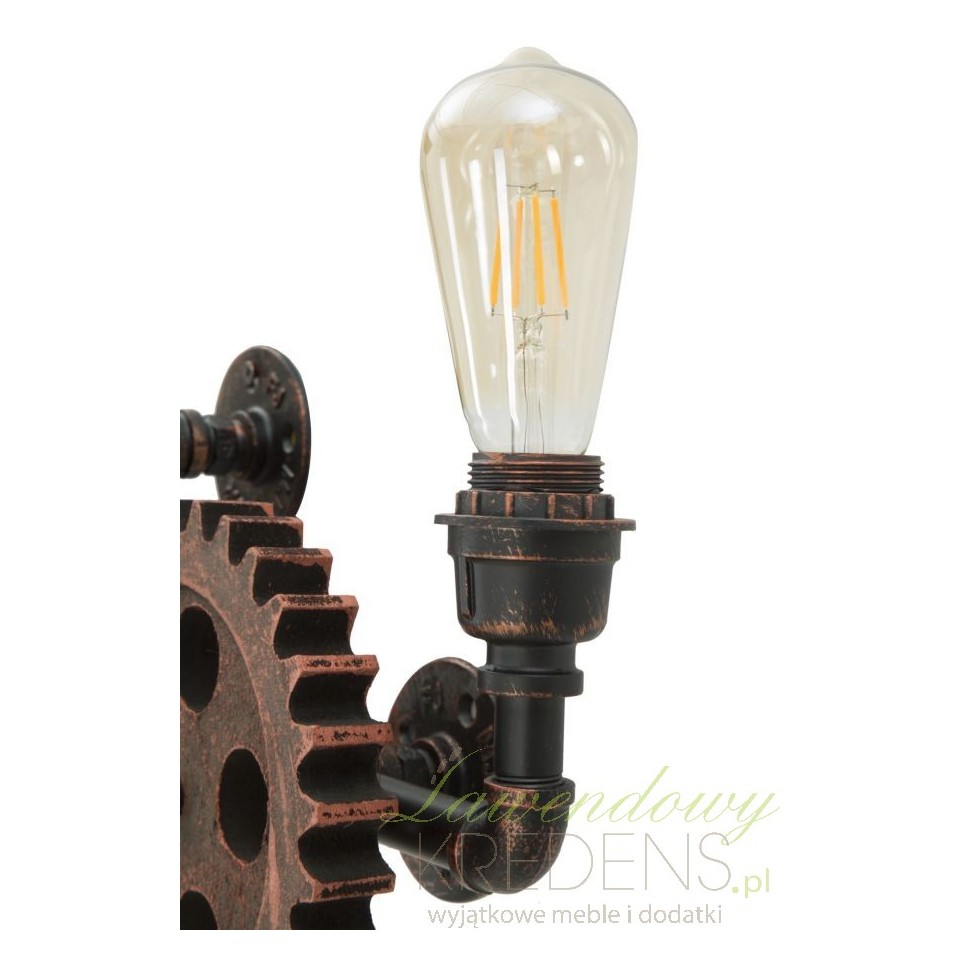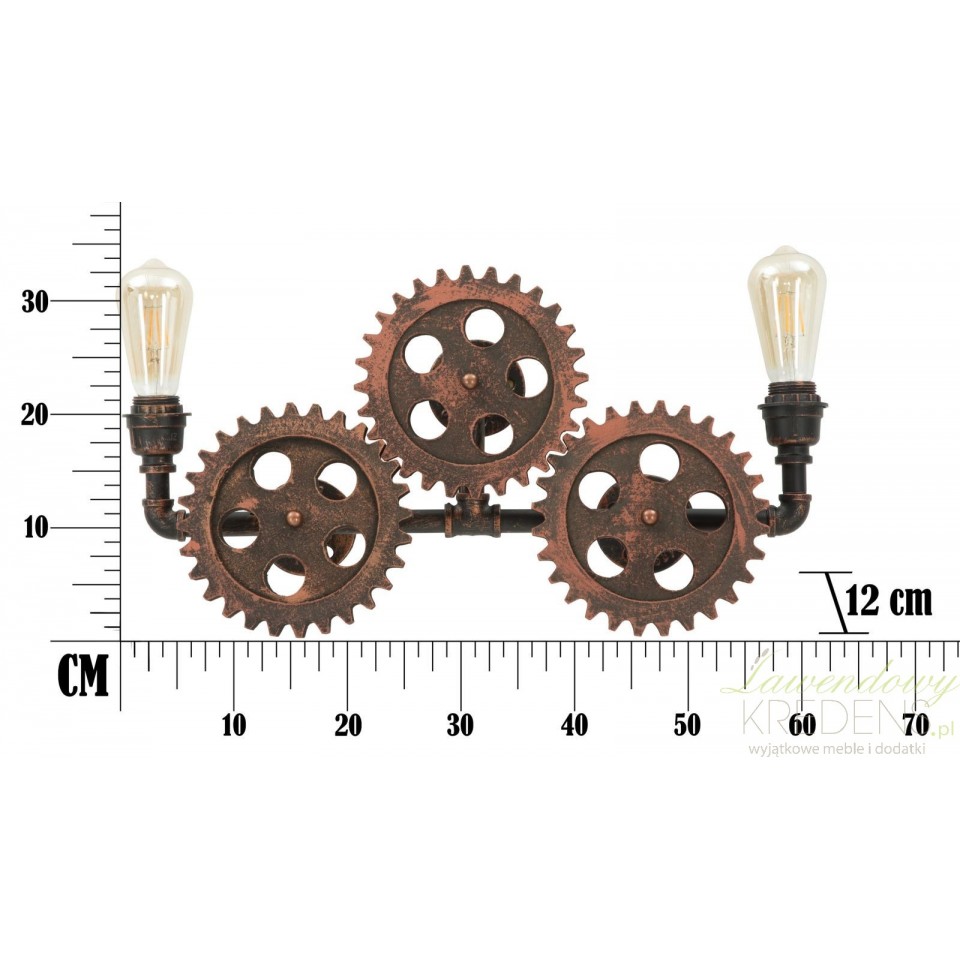 Kinkiet w stylu industrialnym, który widzisz na zdjęciu to model zainspirowany kształtem koła zębatego, a właściwie trzech kół. Zazębiające się koła mają kolor rdzy i posiadają specjalne otwory służące do zamontowania lampy na ścianie. Industrialny kinkiet wyposażony jest w dwa źródła światła, którymi są charakterystyczne, podłużne żarówki skierowane ku górze. Kreatywne, metalowe kinkiety w stylu industrialnym znajdziesz w ofercie marki Mauro Ferretti.