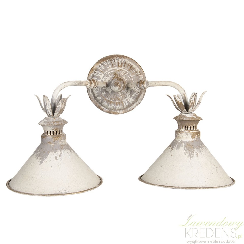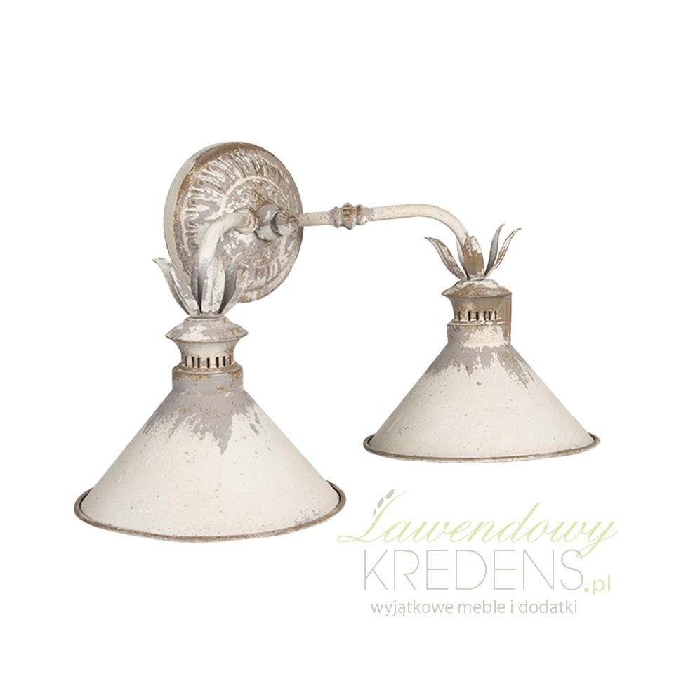 Metalowy kinkiet w stylu prowansalskim z celowo postarzaną powierzchnią, posiada dwa miejsca na żarówki o gwincie E14.