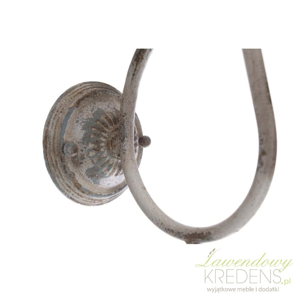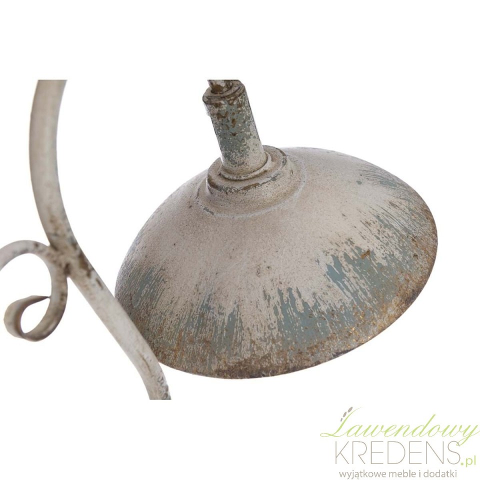 Ten stylowy kinkiet o wymiarach 42 cm szerokości, 23 cm głębokości i 27 cm wysokości przyciąga uwagę dzięki wyjątkowemu wzornictwu. Jego forma nawiązuje do klasycznych lamp ściennych znanych z francuskich dworków i prowansalskich rezydencji. Płaski, rozszerzający się ku dołowi klosz w odcieniu szarości pięknie rozprasza światło, nadając wnętrzu ciepłego, lekko przygaszonego blasku. Metalowa powierzchnia celowo postarzana tworzy subtelne przetarcia i patynę, które dodają charakteru i autentycznego uroku vintage.