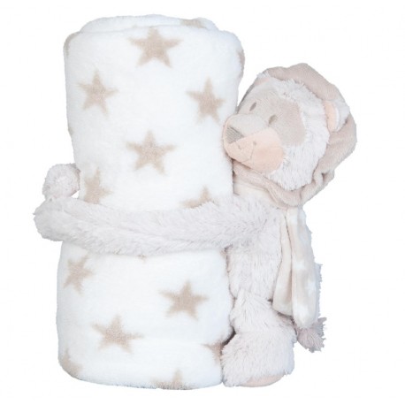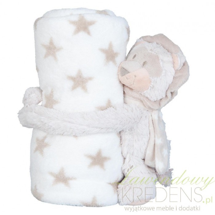 Uroczy kocyk dziecięcy, w delikatny wzór w gwiazdki, z maskotką w postaci lwa!