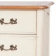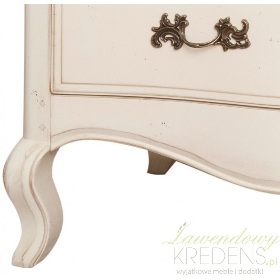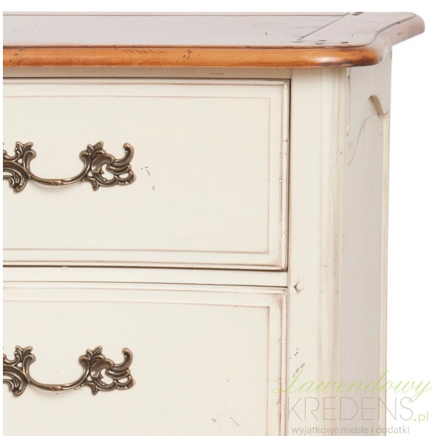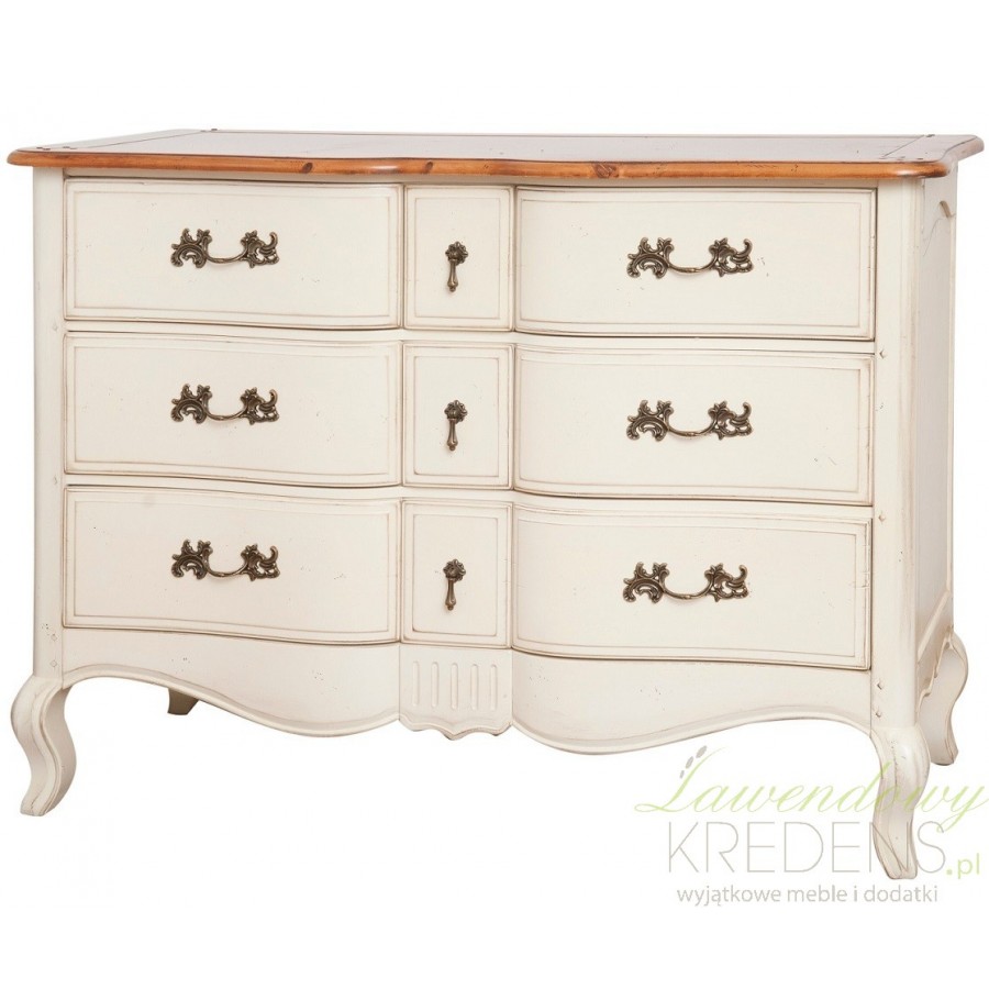 Brzozowa, szeroka komoda w stylu francuskim z przepięknymi uchwytami do otwierania sześciu większych szuflad, pomiędzy które wplecione zostały trzy znacznie mniejsze na mniejsze drobiazgi. Nad całością góruje elegancki, wygodny blat w kolorze naturalnego drewna, który pięknei odcina się na tle kremowej powierzchni komody!