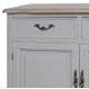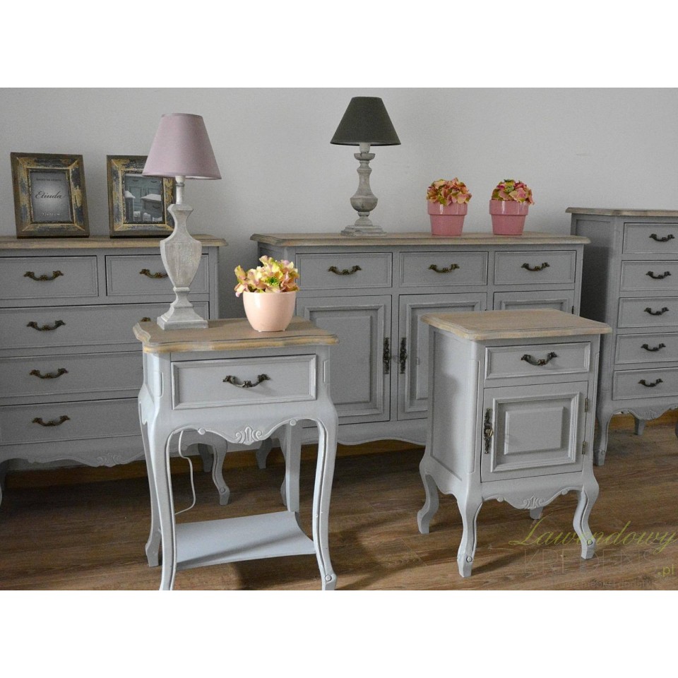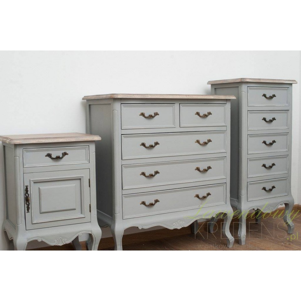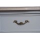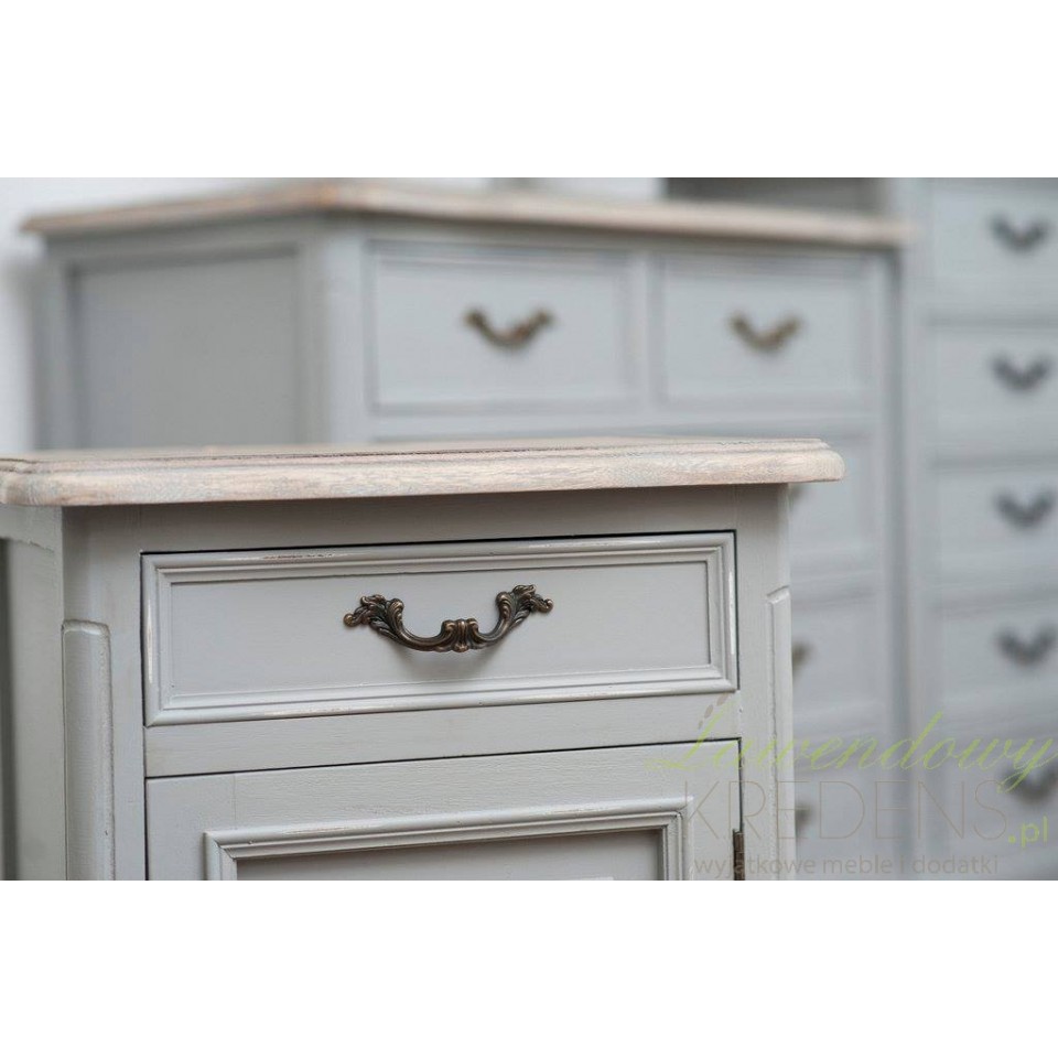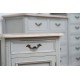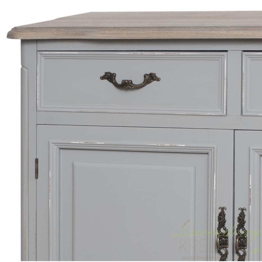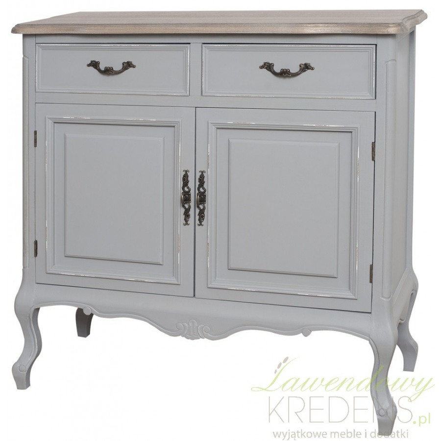 Ustawiona na czterech pięknie wyprofilowanych nogach komoda prowansalska z przestronnymi półkami i dwiema szufladami, które zamykane są wspaniale wyglądającymi uchwytami. Kolorystyka w odciuniu szarości wraz z drewnianym blatem tworza niezapomniana i praktyczną alternatywę dla klasycznych komód!