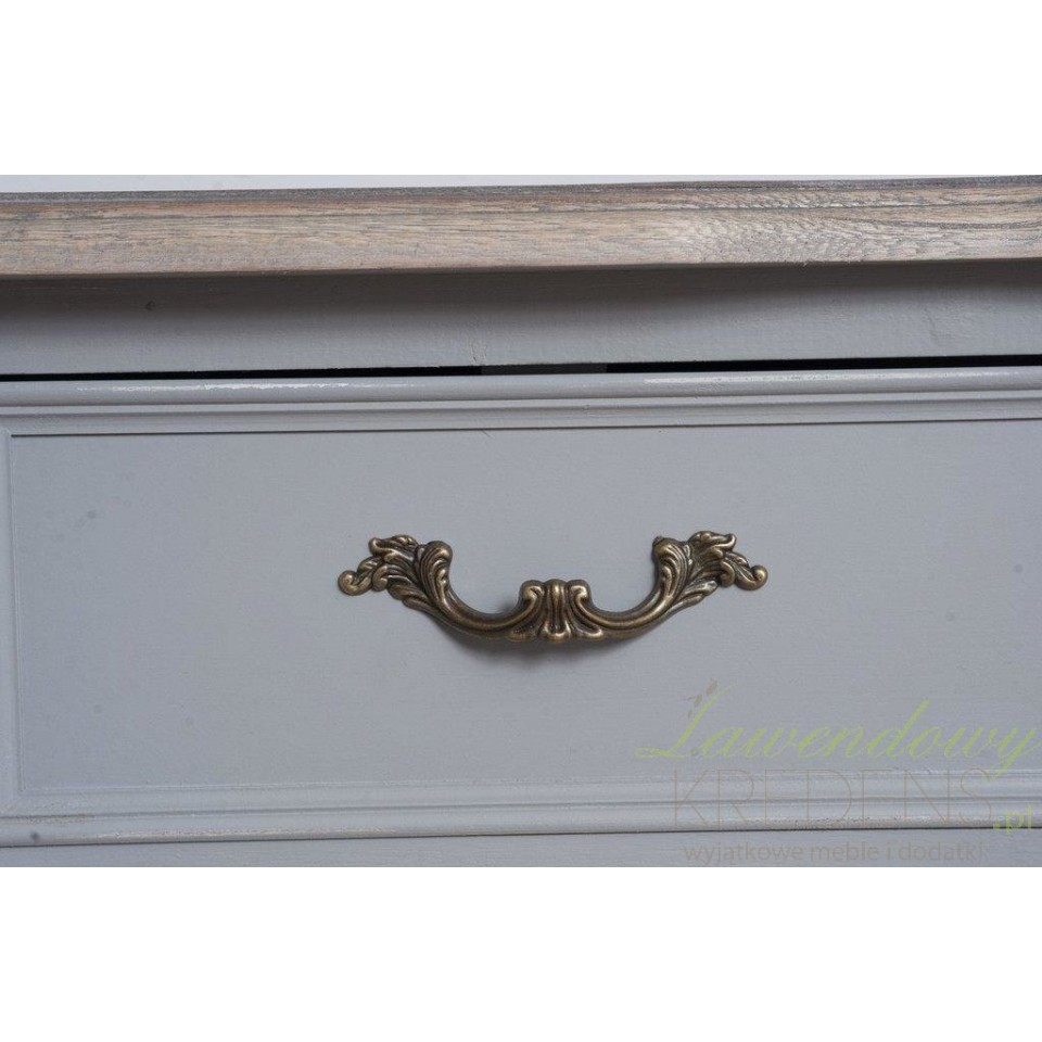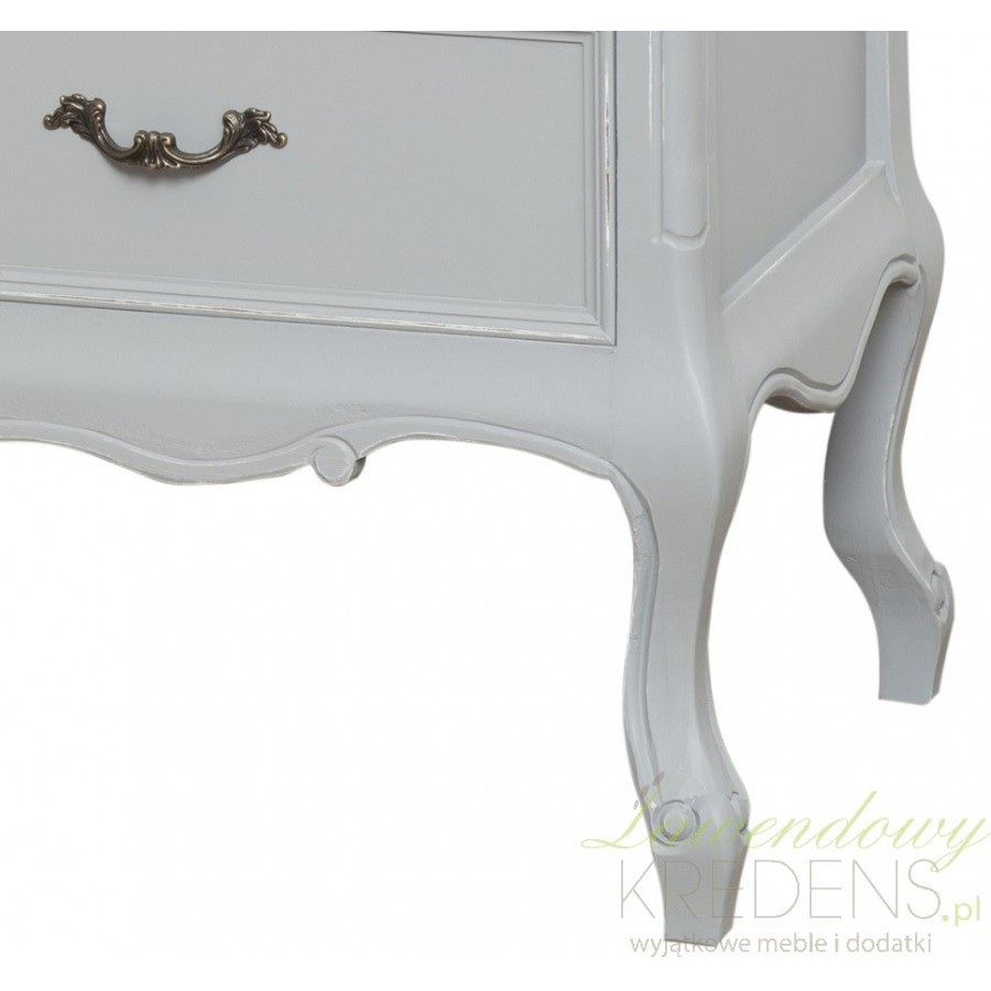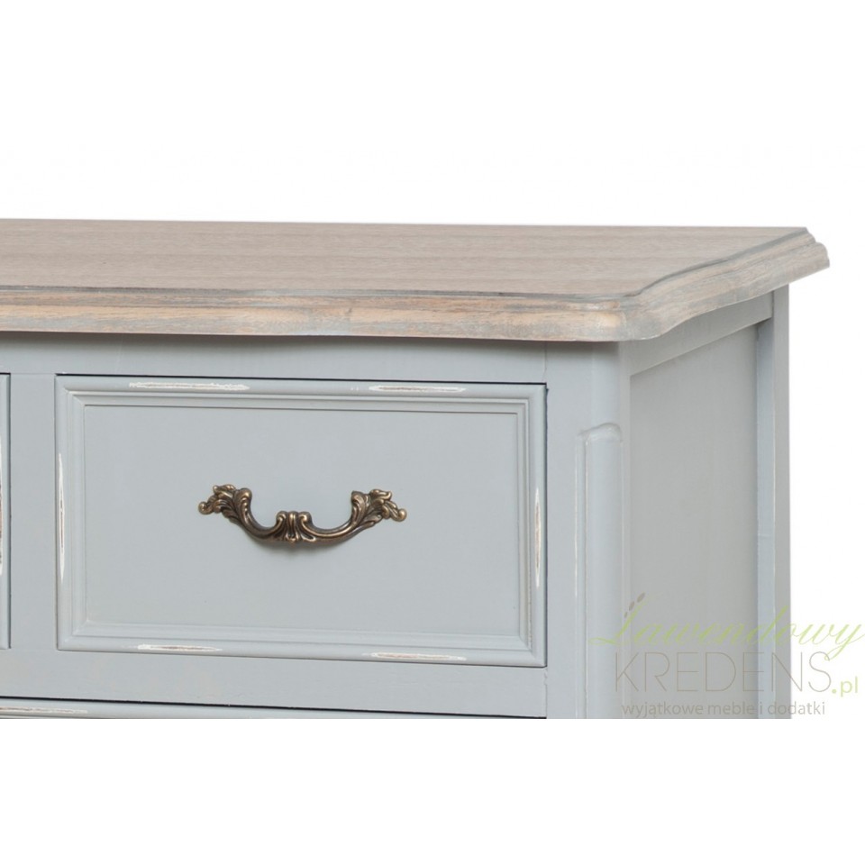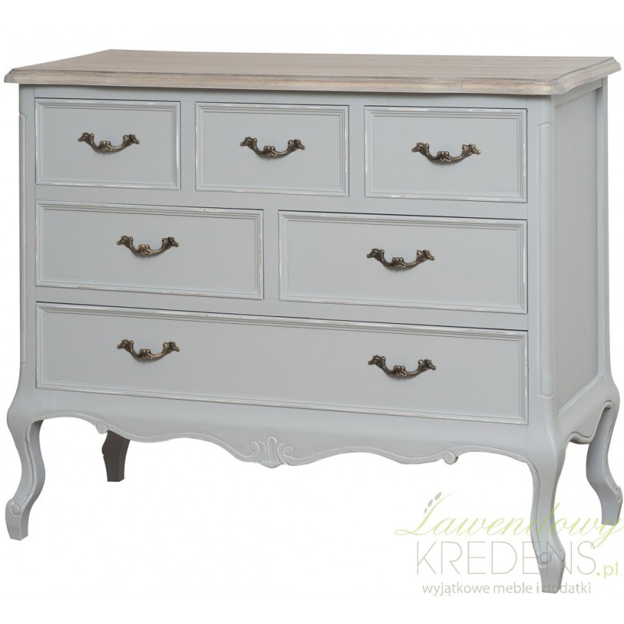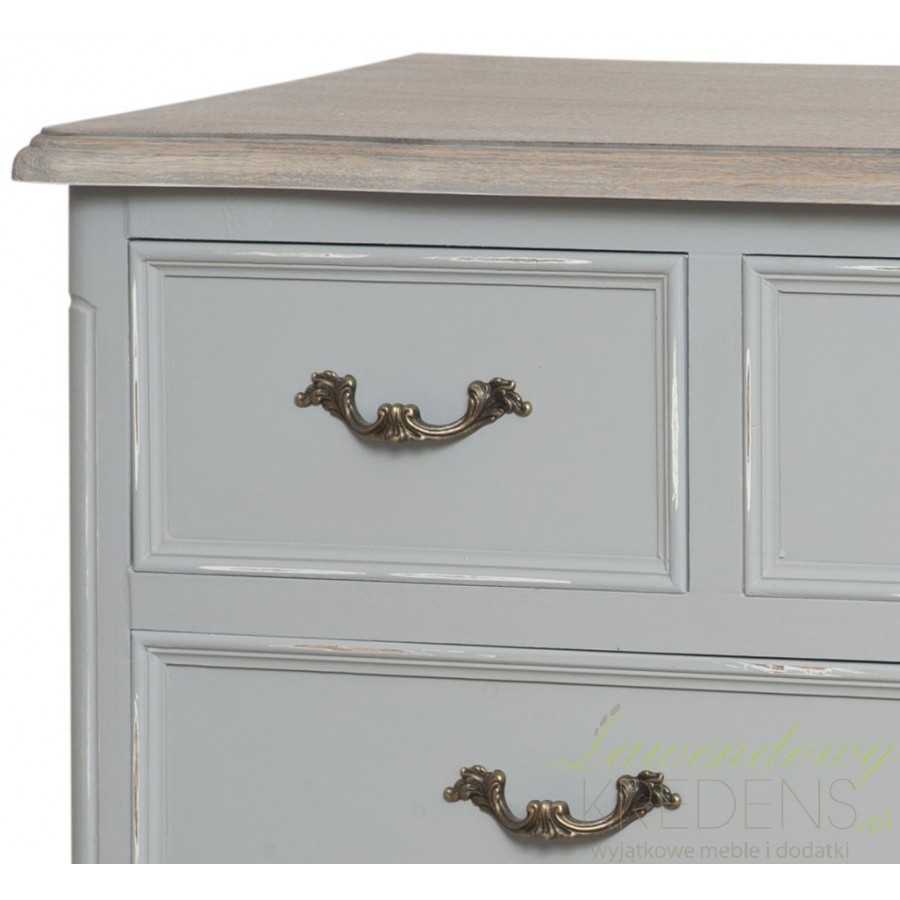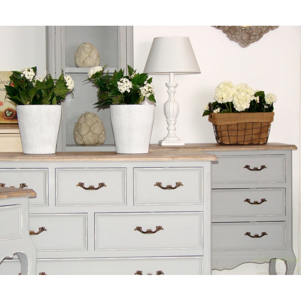 Stabilna i wyjątkowo stylowa komoda prowansalska na czterech pięknie uformowanych nogach nawiązujących do francuskich wnętrz. Niezapomniany kolor w odcieniu szarości cudownie komponuje się ze specjalnie bielonym blatem komody, dzięki czemu zostały uwidocznione regularne słoje drewna.
