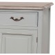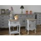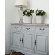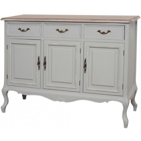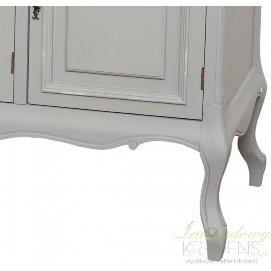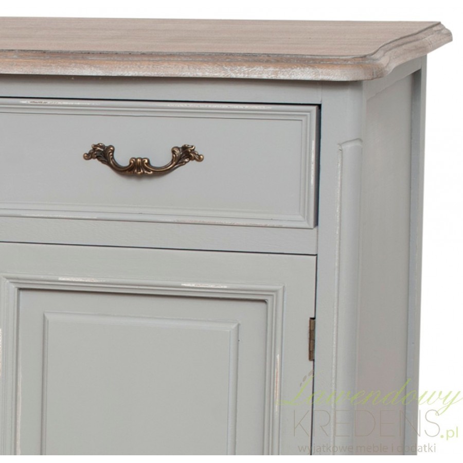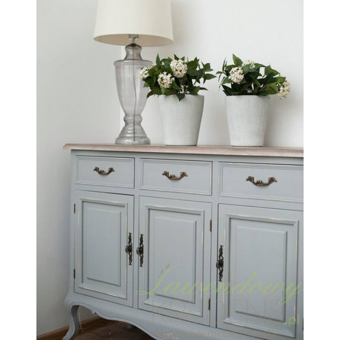 Z wdziękiem łącząca stylowe wykończenie zabudowy z dużą pojemnością ,a tym samym funkcjonalością, komoda w stylu prowansalskim w szarym kolorze, który pięknie komponuje się z ciemnym, brązowym blatem i metalowymi uchwytami szuflad i trzech półek. Bajkowe wnętrze rodem ze słonecznej Prowansji na wyciągnięcie ręki!