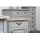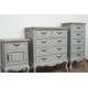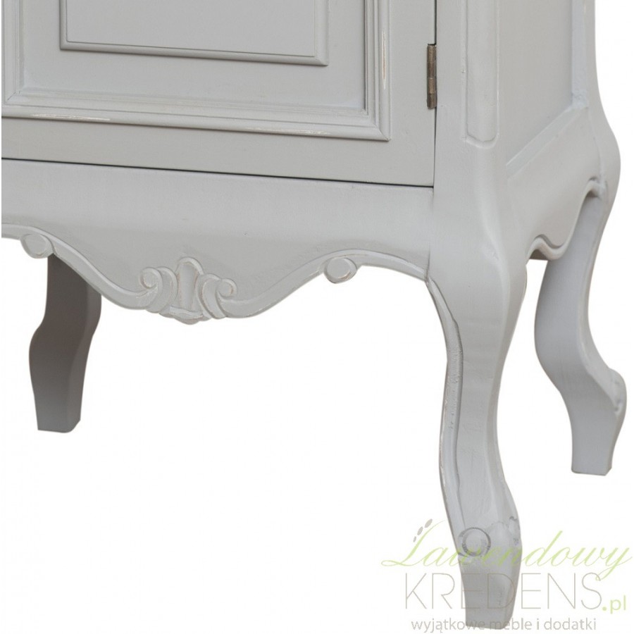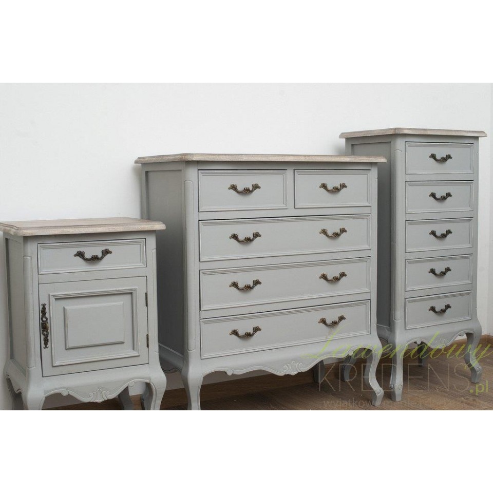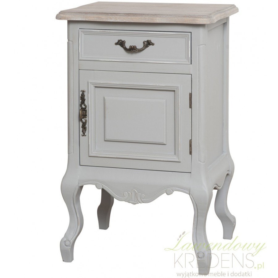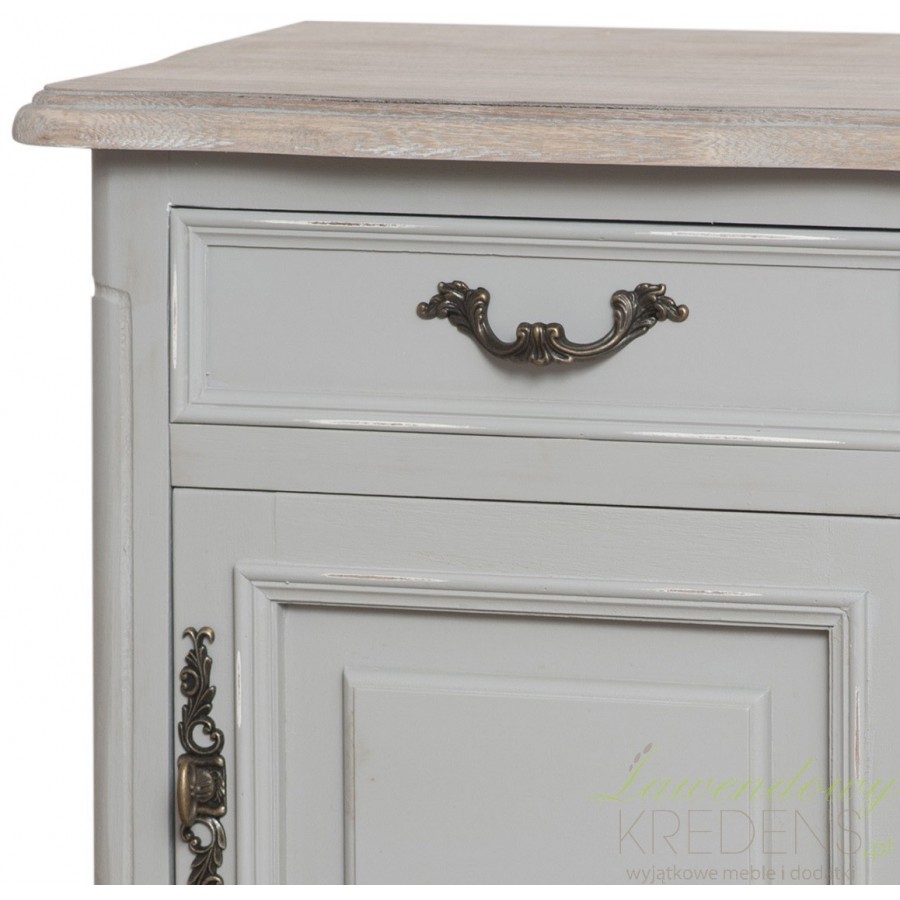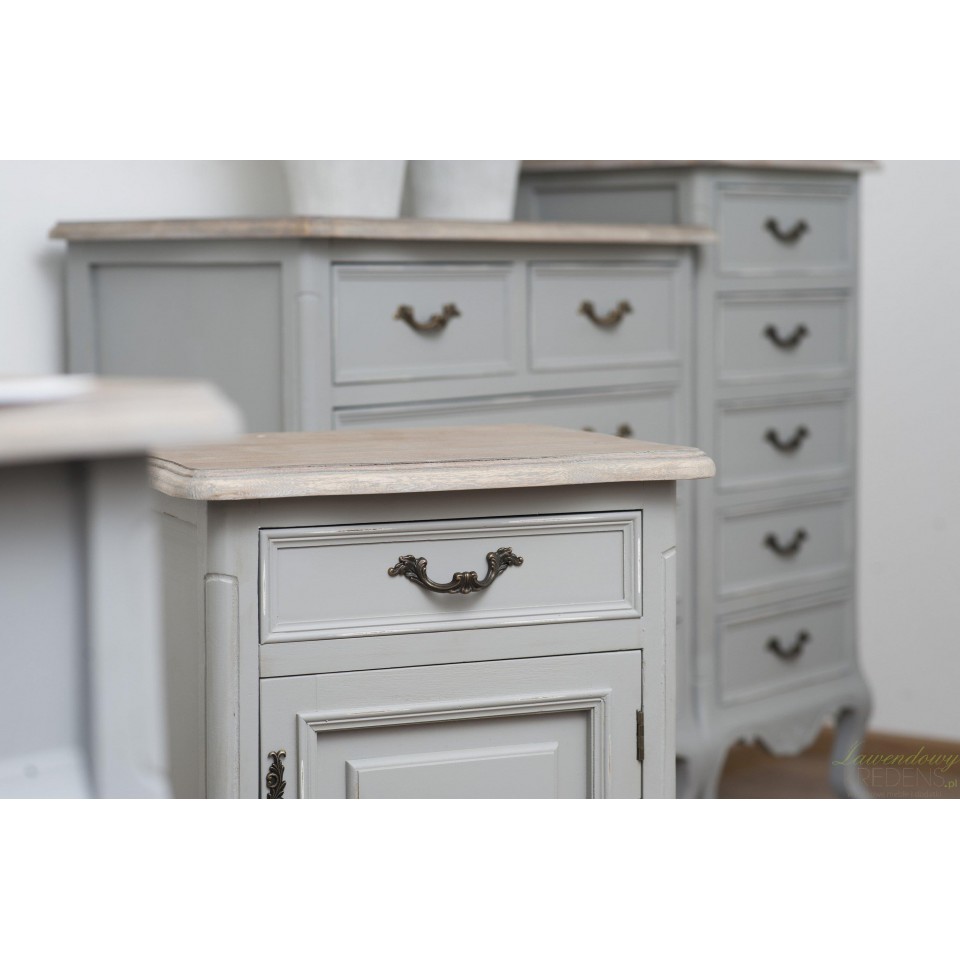 Klasycznie eleganckie i stylowe meble prowansalskie z kolekcji Catania, a wśród nich szafka w stylu prowansalskim z zamykaną ppółką i górną szufladą. Wszystko to w kojącej oczy, szarej tonacji podkreślonej drewnianym blatem i metalowymi uchwytami w złotym odcieniu.