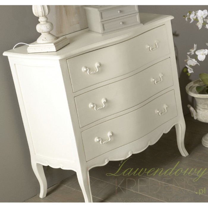Szalenie elegancka i bardzo gustowna komoda prowansalska w olśniewającym, kremowym kolorze, o lekko ściętym boku!