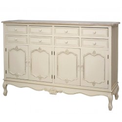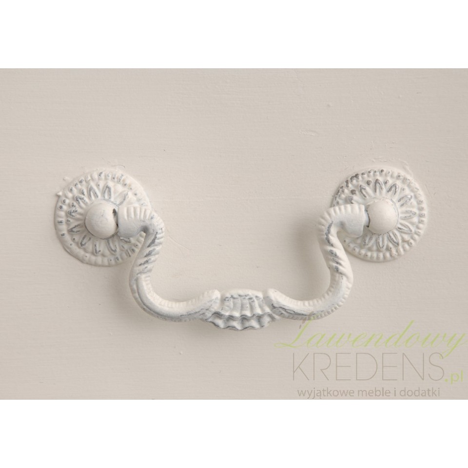 Prawie metrowej szerokości kremowa komoda w stylu prowansalskim, delikatnie ozdobiona znajdującymi sie w dolnej części wycięciami oraz przyprószona miejscowymi otarciami farby, które wprowadzają klimat zeszłych lat. Takie klasyczne podejście do umeblowania wnętrza stwarza wielkie możliwości kompozycyjne!
