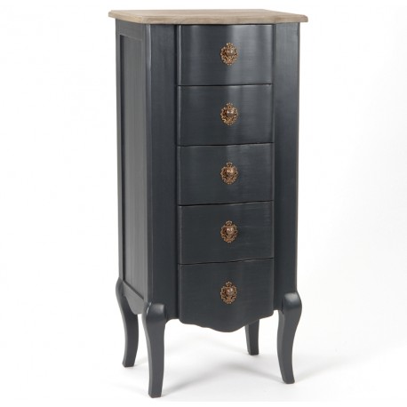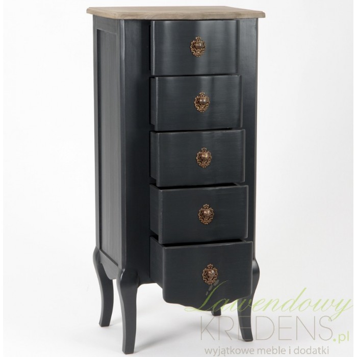 Aż brakuje słów, żeby opisać tak piękny mebel! Wąska komoda prowansalska z kolekcji Lamani z pięcioma szufladami w porządku pionowym, które otwierane są niesamowitymi gałeczkami, które równocześnie stanowią o wyjątkowości tego mebla. Cała komoda w kolorze czarnym świetnie wygląda w zestawieniu z jasnym blatem!