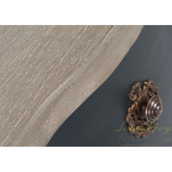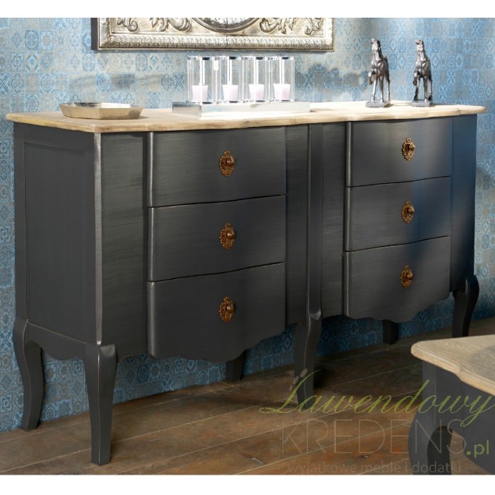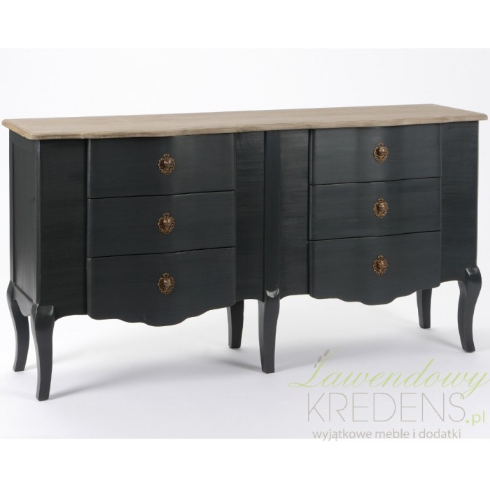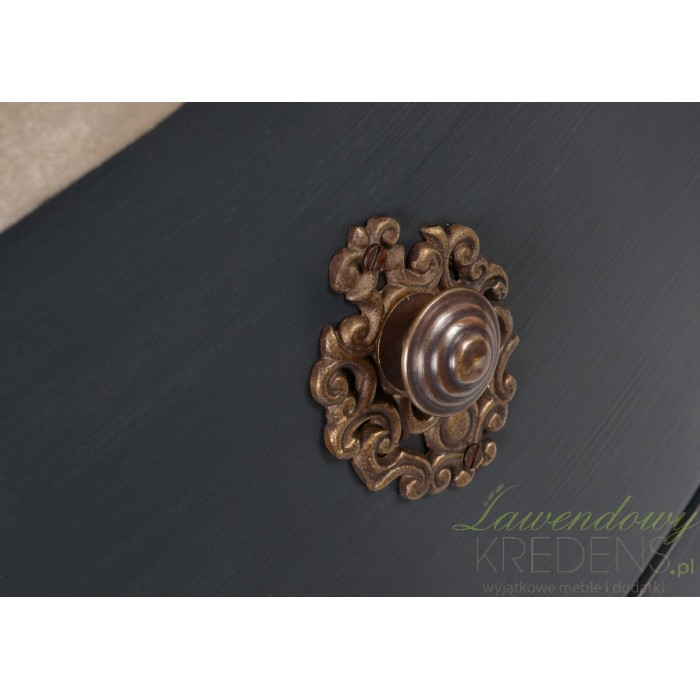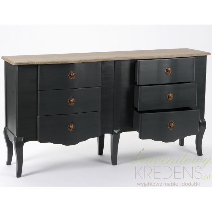 Fantastyczne czarne meble prowansalskie, podkreślony mocnymi nogami o lekko wygiętym profilu. Podobnie jak wszystkie czarne meble z kolekcji Lamani tak i komoda prowansalska charakteryzuje się matową, czarną powierzchnią, zaznaczoną akcentami w postaci dekoracyjnych gałek czy jasnym blatem. Nie oprzesz się jej urokowi!