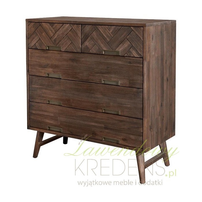 Komoda Livin Hill wykonana jest z wysokiej jakości drewna akacji. Komoda Ashton ma piękny brązowy kolor i stoi na niewielkich nóżkach. Posiada trzy duże szuflady na ubrania i bieliznę i dwie mniejsze na przykład na biżuterię. Mają one kształt uroczej jodełki. Meble Livin Hill doskonale będą wyglądać w salonie czy jadalni.