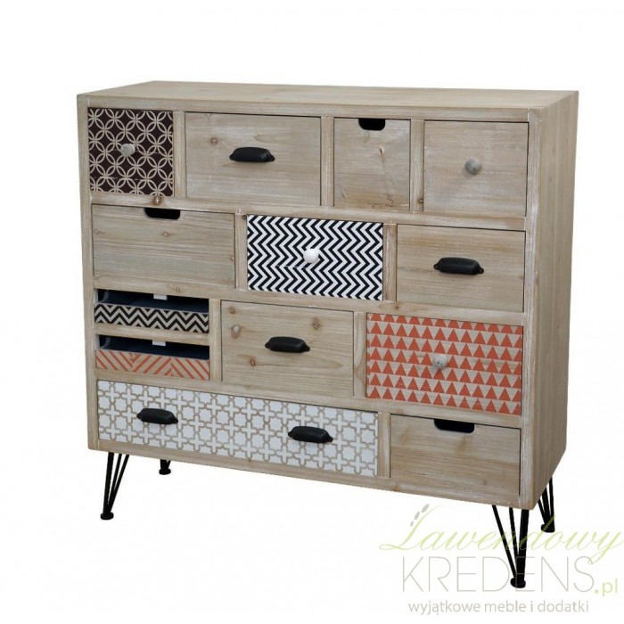 Komoda od marki Livin Hill w stylu retro wyróżnia się wzorzystymi szufladami. Każda z szuflad w komodzie jest inna, dzięki czemu łatwiej zapamiętasz co znajduje się w poszczególnych szufladach. Komoda z kolorowymi szufladami jest wykonana z użyciem drewna i ustawiona na metalowych nóżkach. Nie bój się zmian na lepsze, komoda Loano gwarantuje tylko takie!