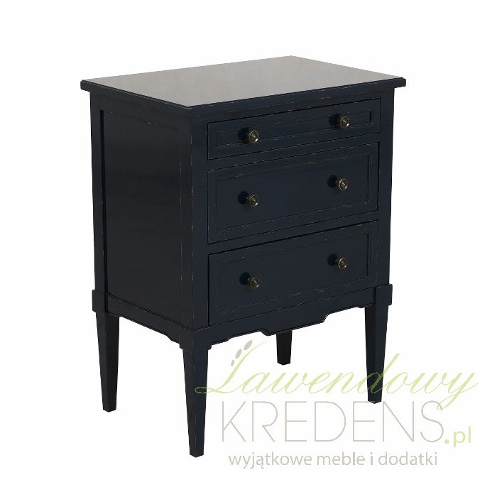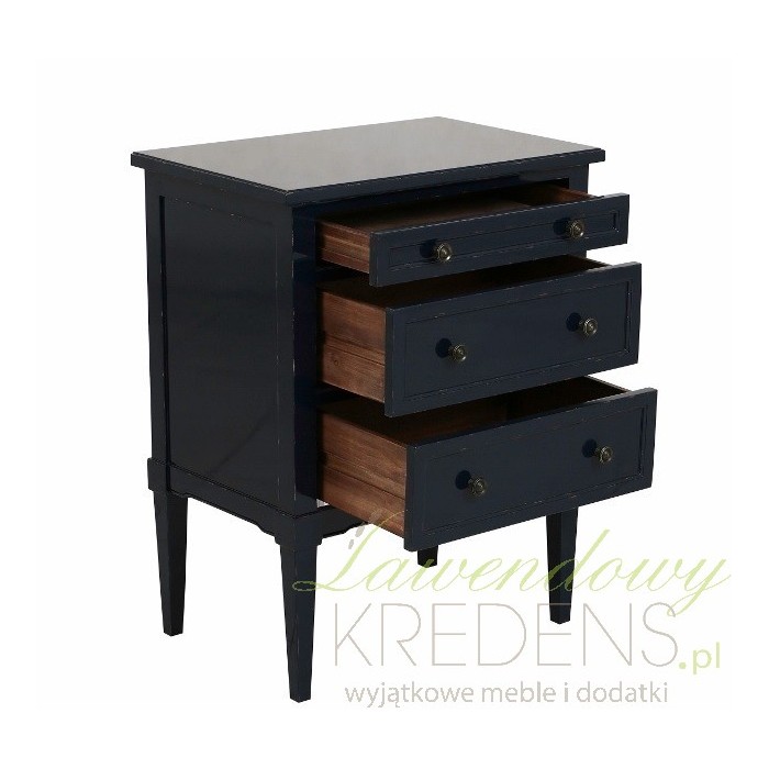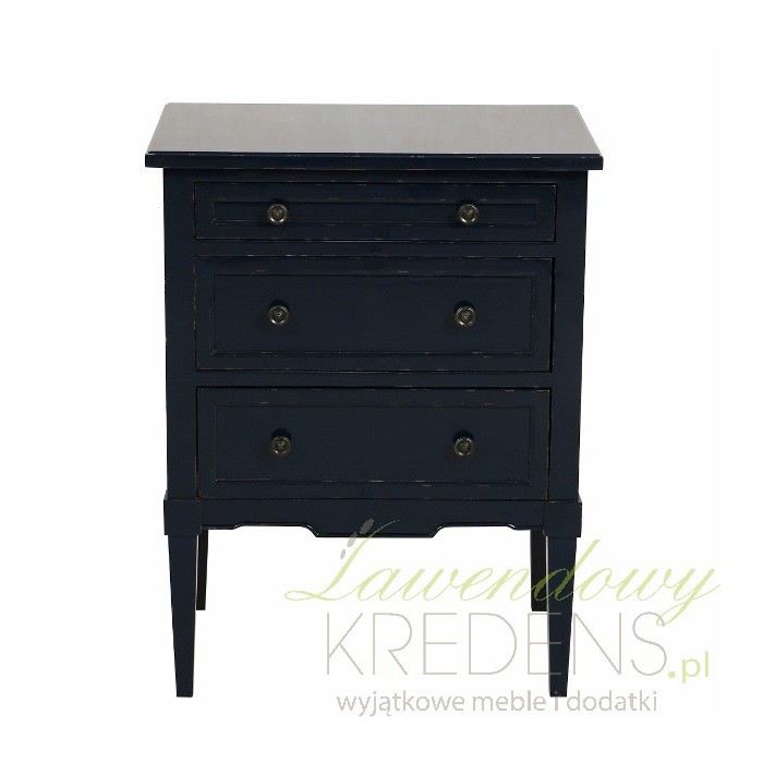 Wąska komoda Classic Eclectic z serii Indygo ma trzy szufladki, które pomieszczą tekstylia, bibeloty, kosmetyki lub pościel.