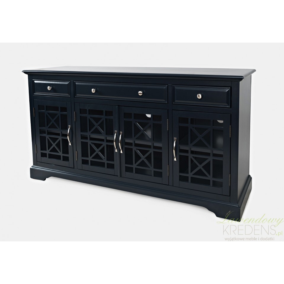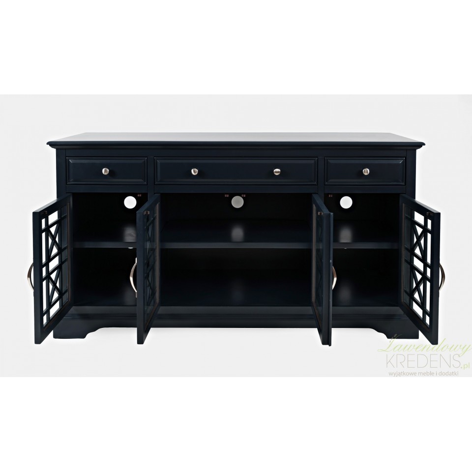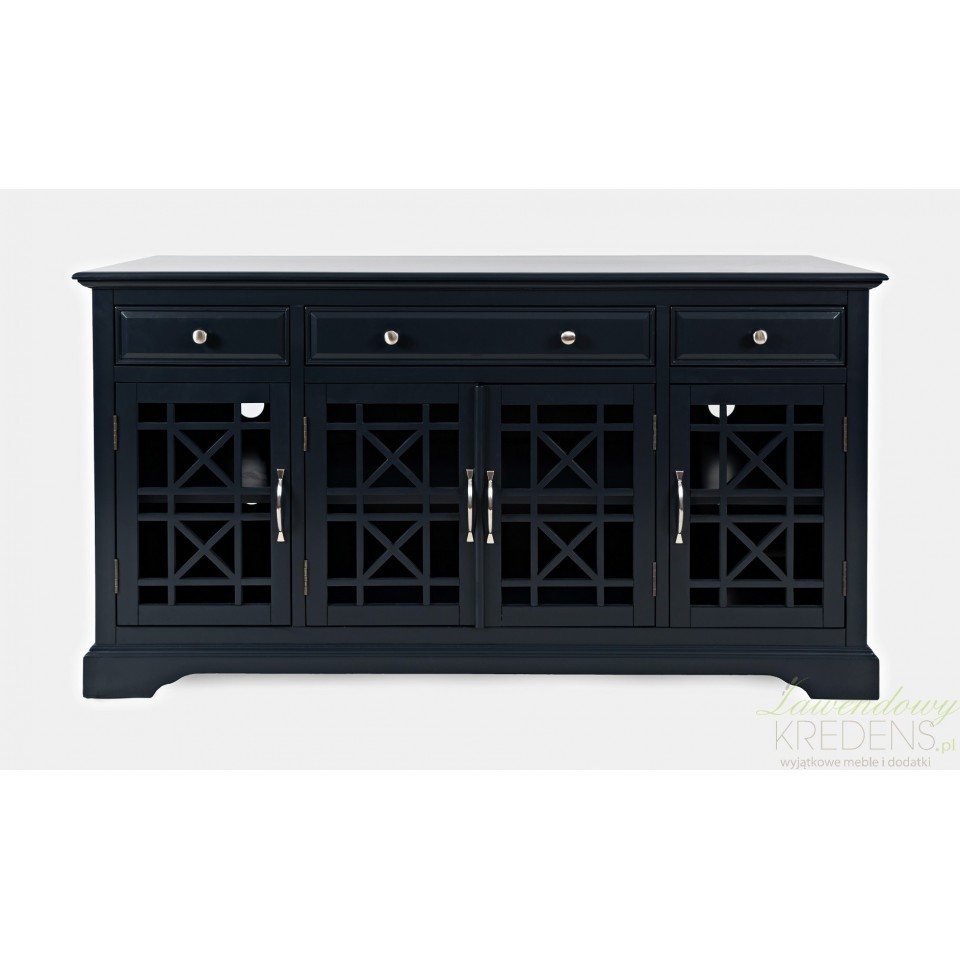 Czterodrzwiowa komoda Avola wyposażona jest w przeszklone drzwi, które dodatkowo wyposażone są w szprosy układające się w geometryczne wzory. Masywna, wykonana z drewna akacji i malowana na ciemnogranatowy kolor sprawi, że wnętrza takie jak salony i jadalnie zyskają dozę nowoczesnej elegancji. Meble Avola, które znajdziesz w naszym sklepie wykonane zostały w kilku wersjach kolorystycznych. Twoje wnętrze zasługuje na meble Livin Hill!