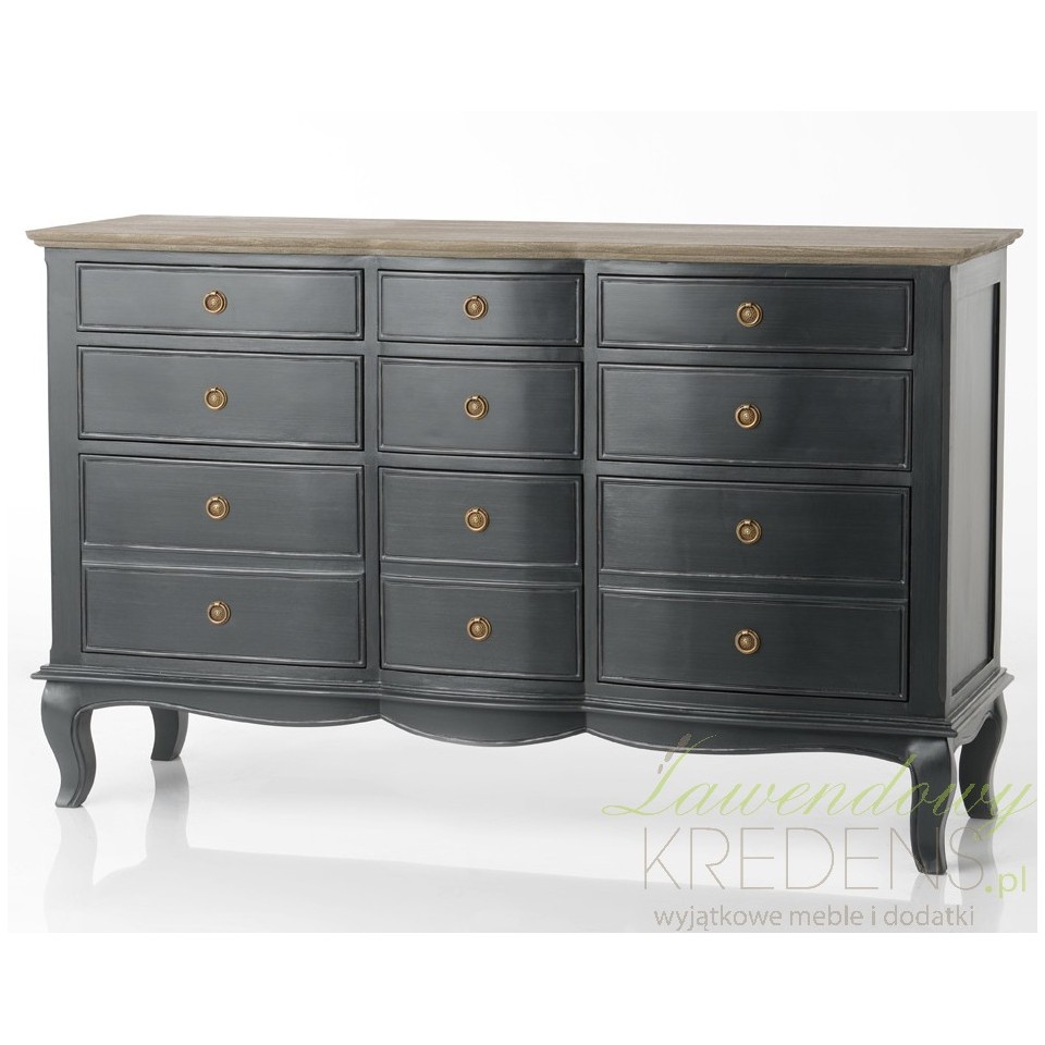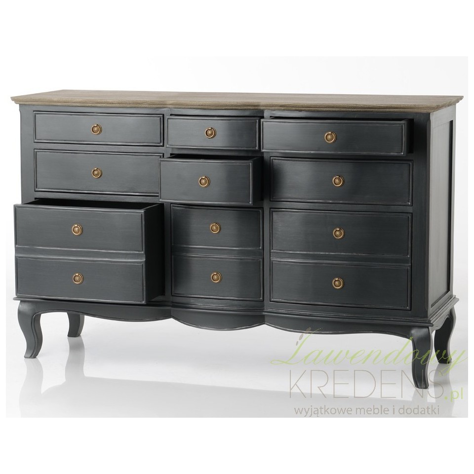 Oryginalna komoda w stylu prowansalskim w kolorze ciemny grafit z efektem postarzenia. Charakterystyczne uchwyty metalowe nadają jej uniwersalny i ponadczasowy wygląd.