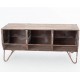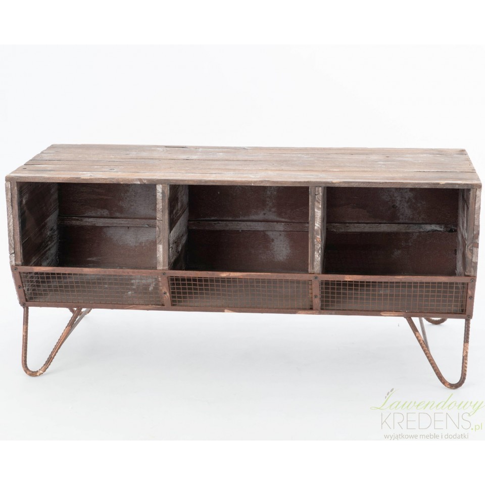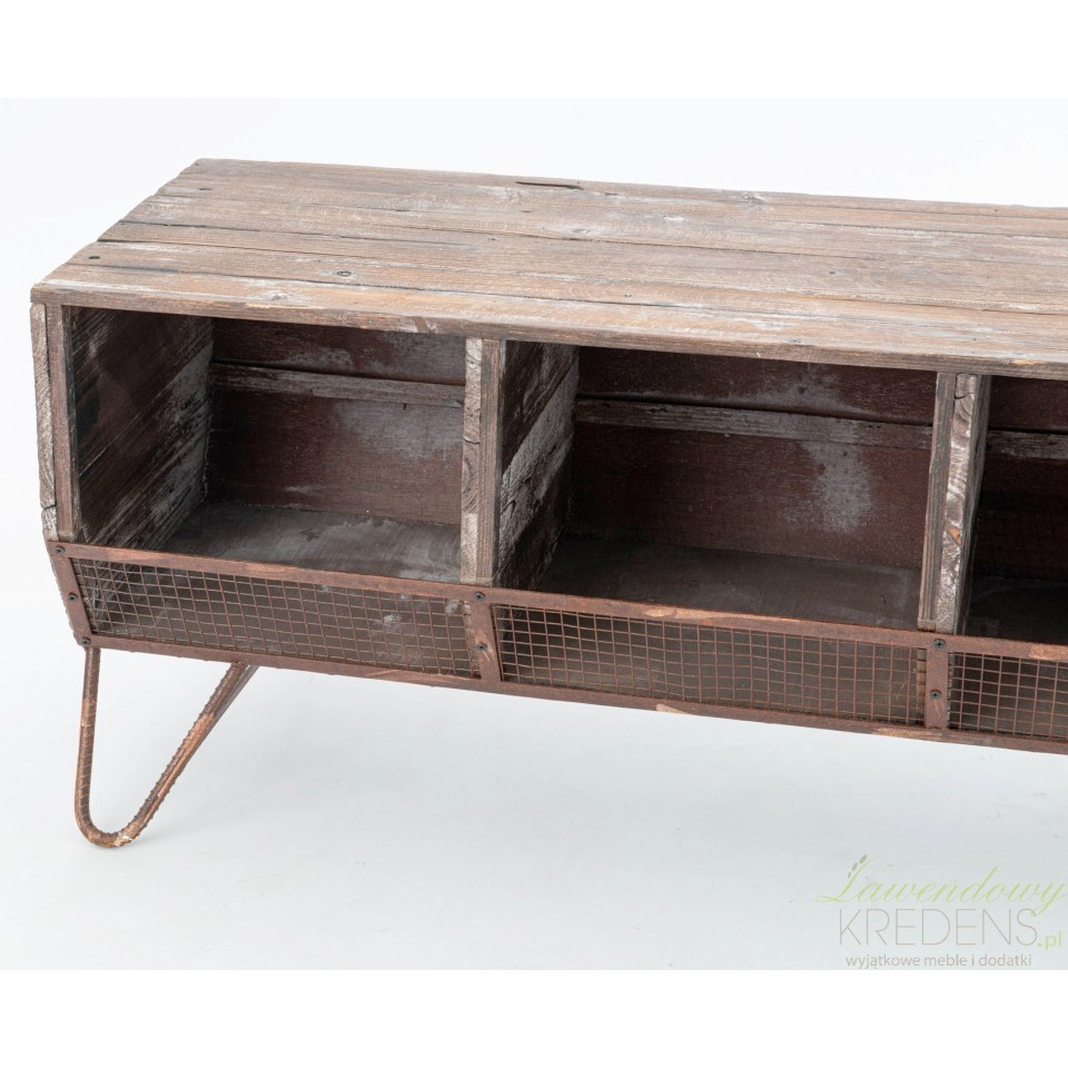 Tradycyjny mebel w postarzanym, starodawnym wykończeniu z drewna z recyklingu to niska komoda industrialna. Wykonana z desek komoda posiada trzy przegródki zabudowane częściowo metalową kratką, która ma za zadanie zabezpieczać zawartość przed wypadaniem. Meble industrialne, którym nie żałowano efektu postarzeń są doskonałym urozmaiceniem dla zwykłych aranżacji. Komody w stylu industrialnym to świetne miejsce do przechowywania gazet w salonie, miejsce pod telewizor lub lampy i wazon z kwiatami.