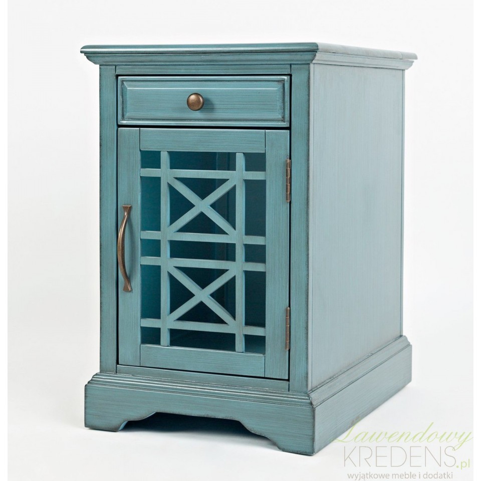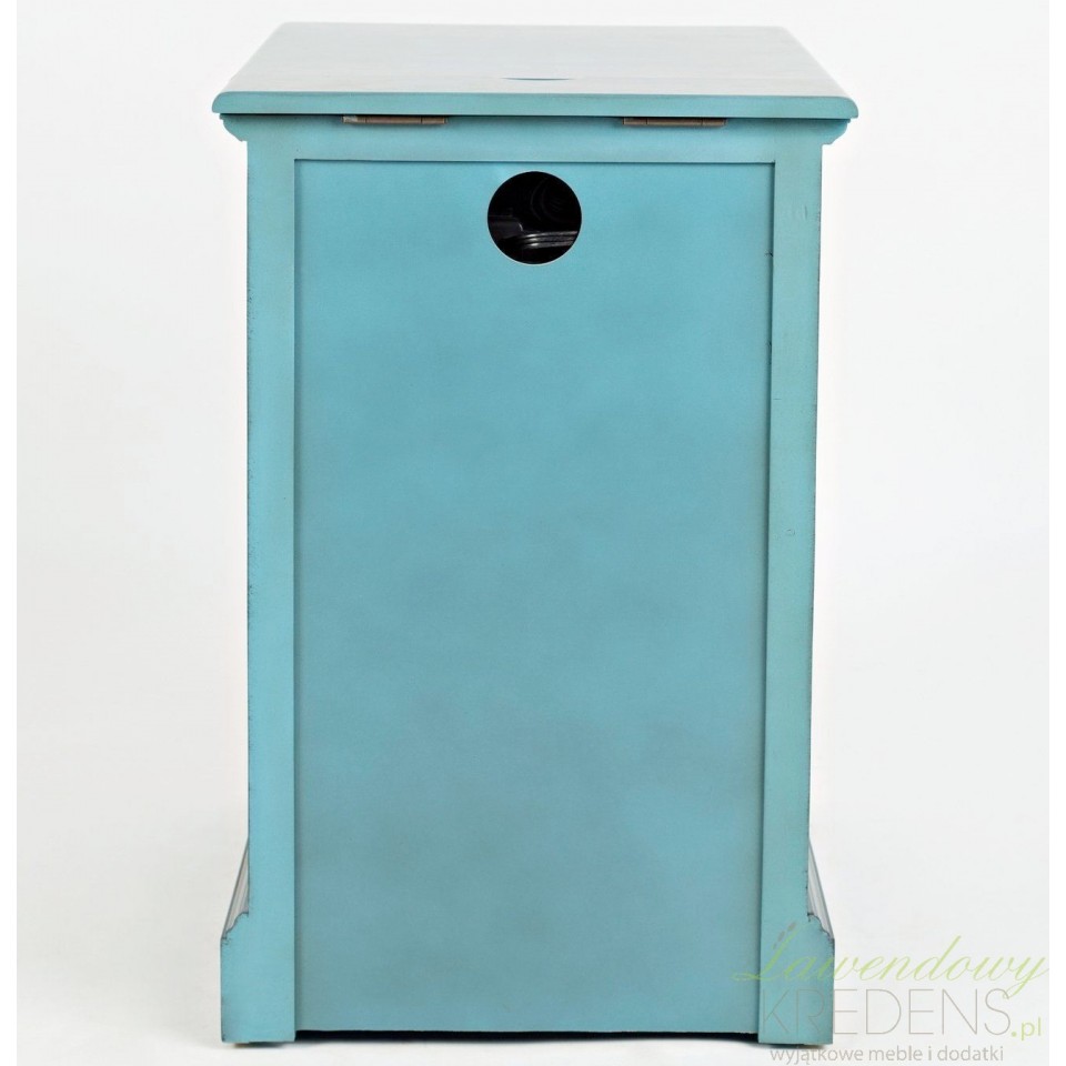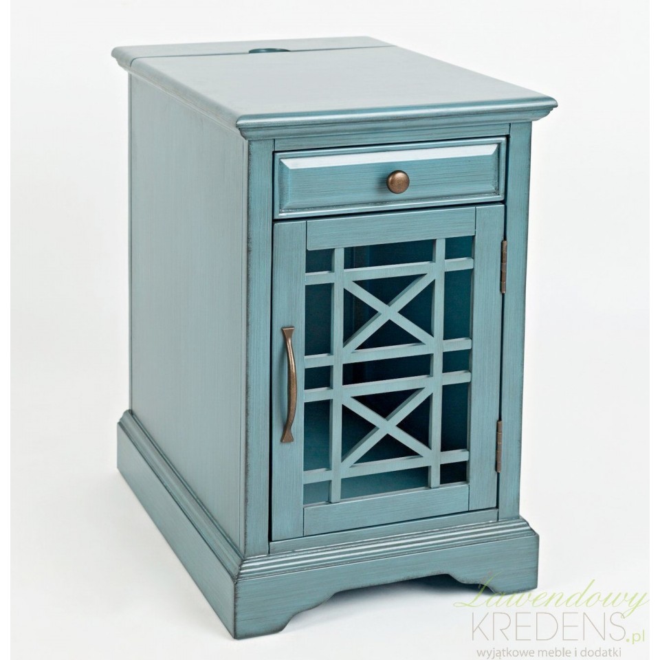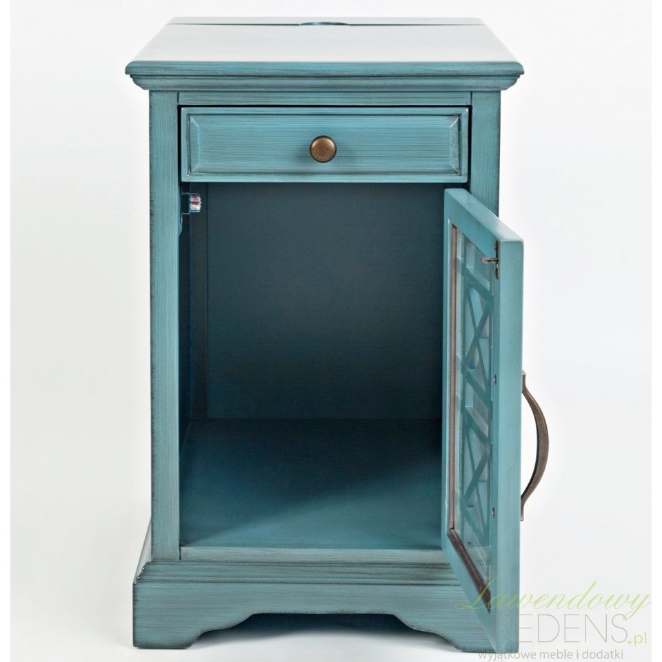 Szafka Avola Antique Blue to nie tylko piękny element wystroju, ale także funkcjonalny mebel użytkowy. Wyposażona w praktyczną szufladę oraz szafkę z przeszkleniem, umożliwia wygodne przechowywanie niezbędnych drobiazgów. Dzięki wbudowanemu gniazdku i portowi USB możesz z łatwością ładować telefon, tablet lub inne urządzenia – bez konieczności korzystania z dodatkowych kabli i przedłużaczy.