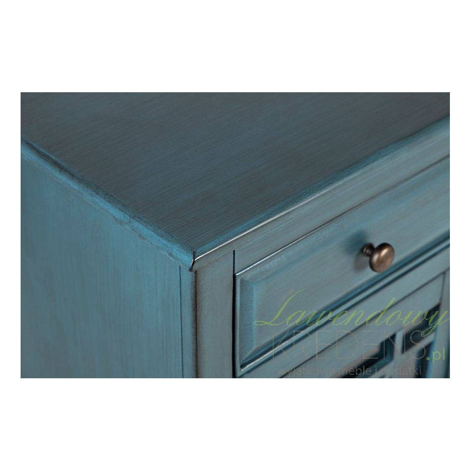 To idealny mebel do wnętrz, w których liczy się zarówno styl, jak i komfort codziennego użytkowania. Niebieski kolor dodaje wnętrzu świeżości, a subtelne detale – jak mosiężne uchwyty czy lekko przetarte krawędzie – wprowadzają atmosferę ciepła i elegancji.
