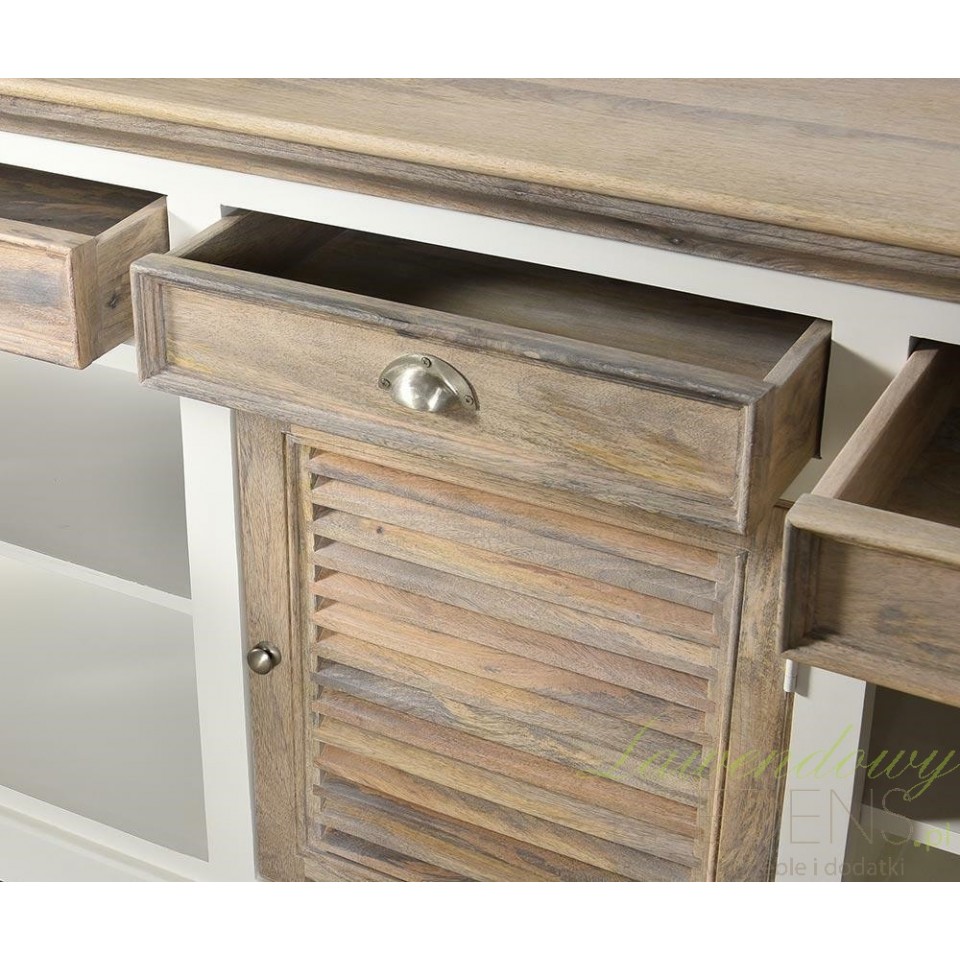 Komoda Belldeco Bristol White 2B w stylu prowansalskim i skandynawskim. Ręcznie malowana, z blatem z mango i żaluzjowymi frontami – idealna do eleganckiego wnętrza.