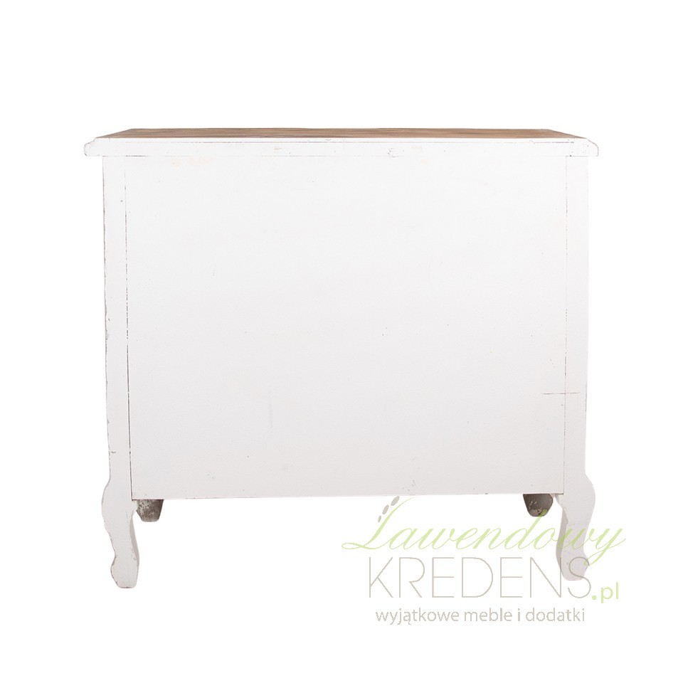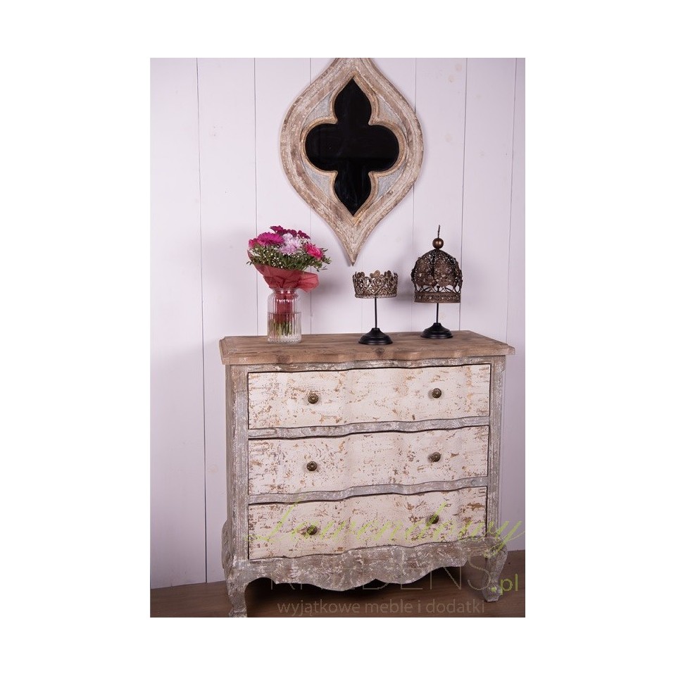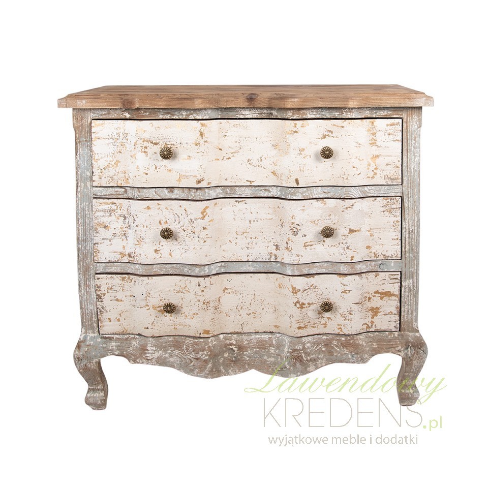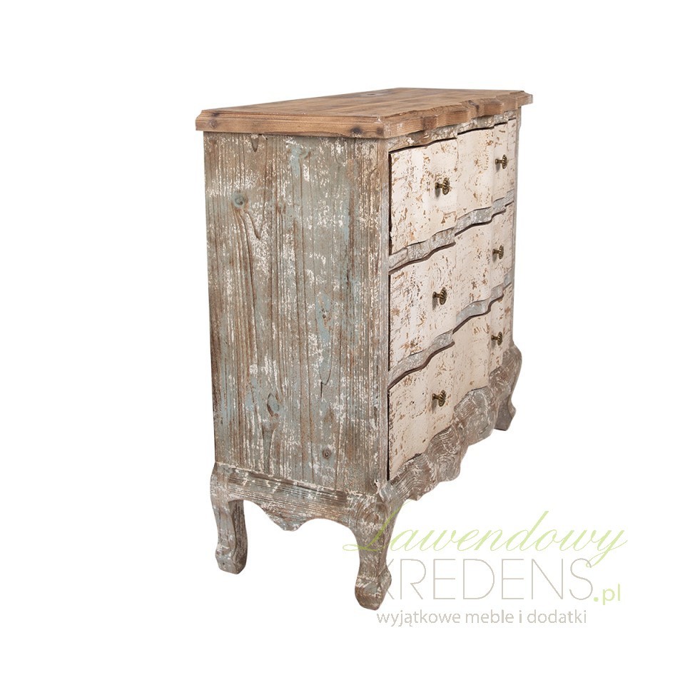 Kapitalna komoda w stylu prowansalskim postarzana oczarowuje zgrabnym kształtem, na który wpływ mają liczne zaokrąglenia.