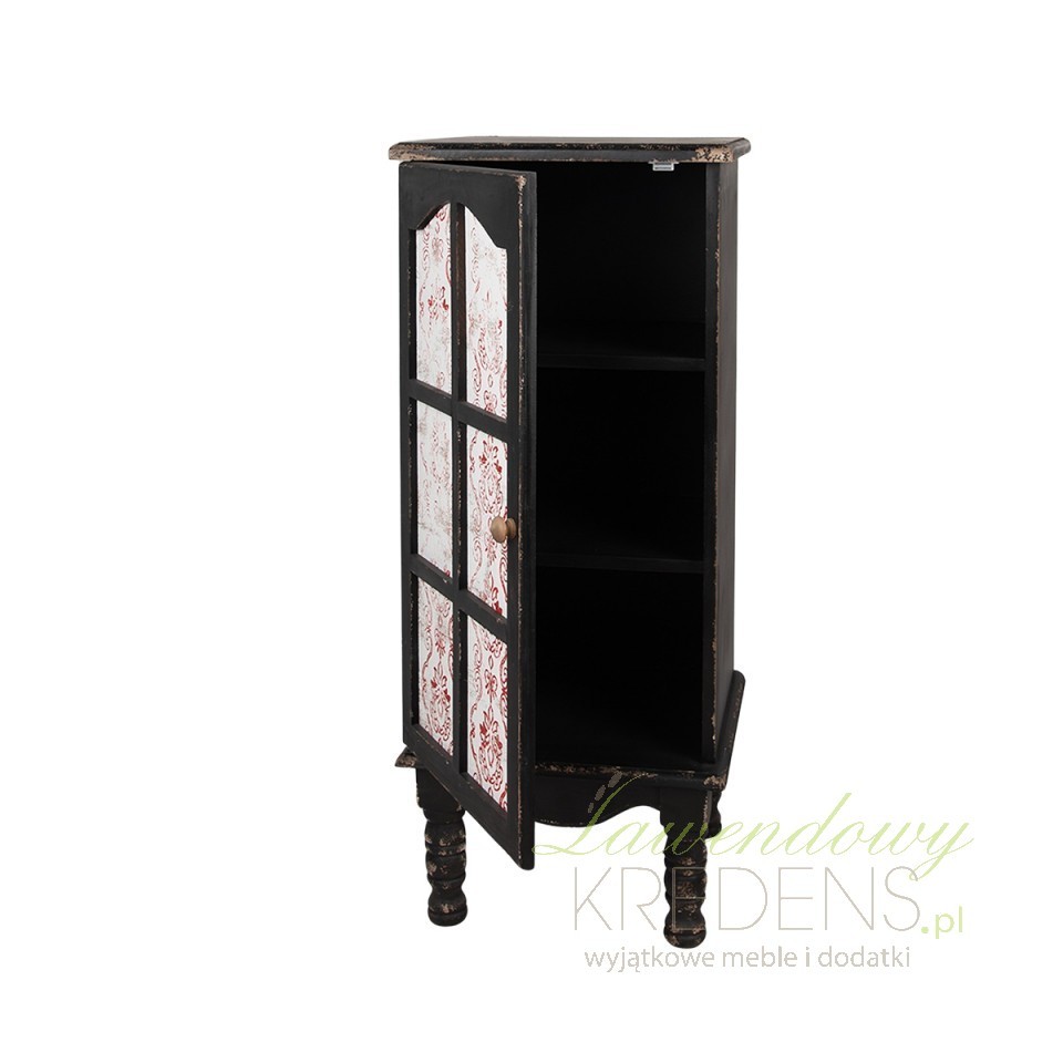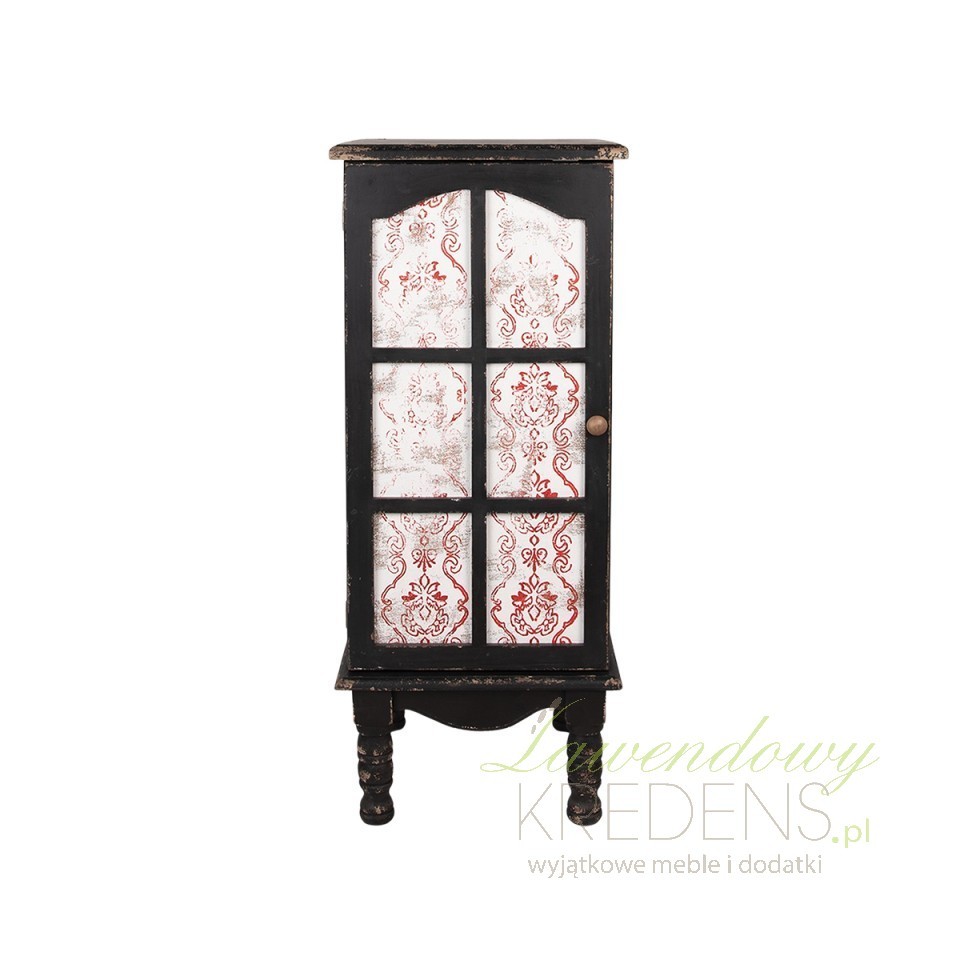 Charakterystyczny przeszklony front z delikatnym, romantycznym wzorem w odcieniach czerwieni i beżu przywołuje klimat południowej Francji. Szafka ma smukłą formę i lekko zdobione nogi, które nadają jej lekkości i klasy. Doskonale sprawdzi się jako komoda, witrynka lub szafka na dekoracje – wprowadzi do wnętrza niepowtarzalny klimat prowansalskiego domu.