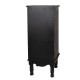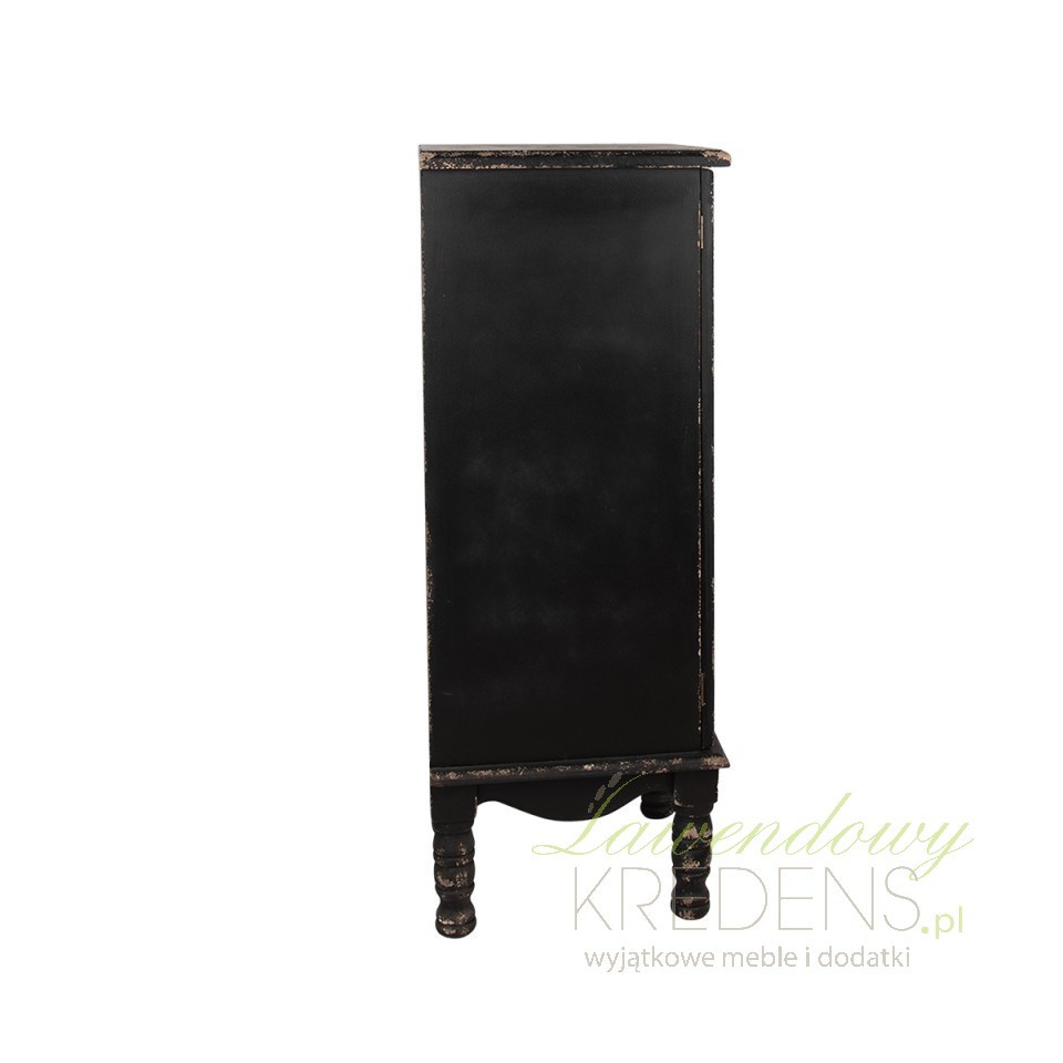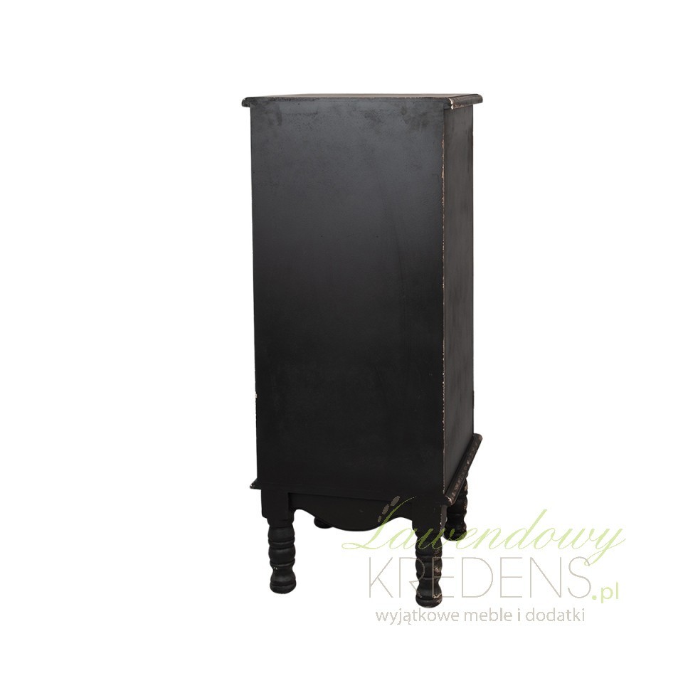 To mebel, który łączy praktyczność z wyjątkową estetyką. Jego kompaktowa forma sprawia, że doskonale odnajdzie się zarówno w dużych, jak i mniejszych przestrzeniach. Dzięki połączeniu czerni z delikatnym zdobieniem wnosi do wnętrza harmonię i artystyczny klimat, idealny dla miłośników stylu prowansalskiego, shabby chic i vintage.