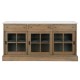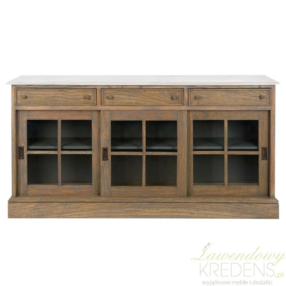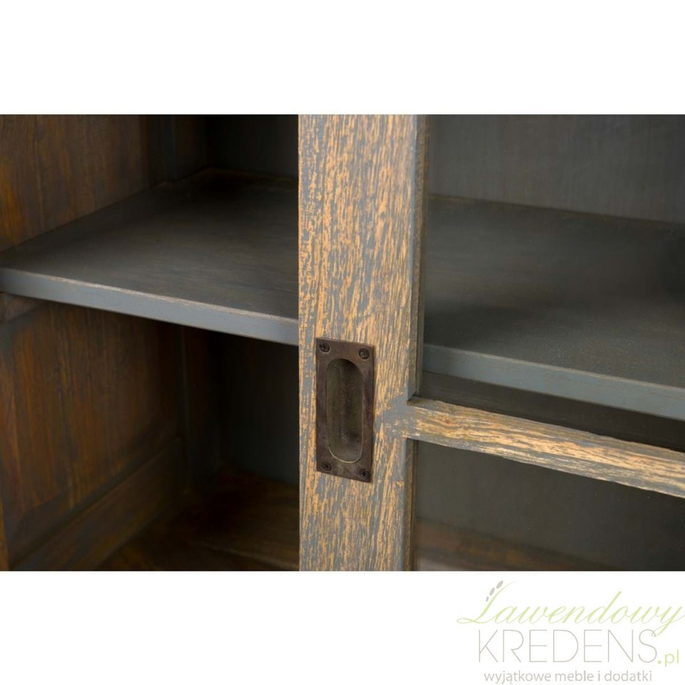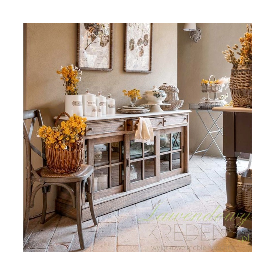 Trzy przesuwne, szklane drzwi o urokliwej formie okienek z delikatnymi szprosami to wizytówka tej komody. To nie tylko sposób na wyeksponowanie ulubionych przedmiotów, ale także sposób na wprowadzenie subtelnej przejrzystości do pomieszczenia. Otworzą się one na historię, którą ta komoda niesie ze sobą.