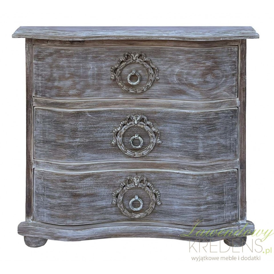 Konstrukcja szafki opiera się na solidnej ramie z drewna, co zapewnia stabilność i długowieczność mebla. Fronty zdobią delikatne frezowania oraz stylowe uchwyty, podkreślające jej rustykalny charakter. Szafka oferuje trzy pojemne szufladki, które umożliwiają przechowywanie różnorodnych przedmiotów, od książek po dekoracje, pomagając utrzymać porządek w pomieszczeniu.