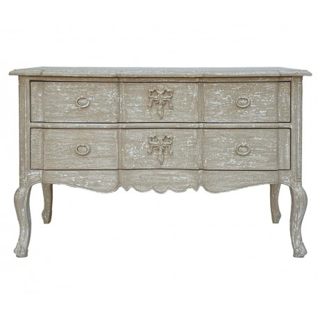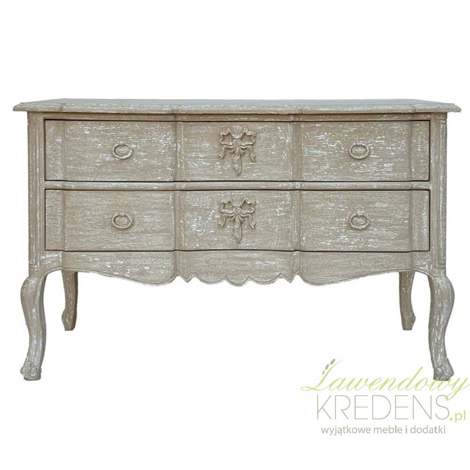 Komoda w stylu francuskim Orangerie wykonana z wysokiej jakości drewna mango w subtelnym beżowym odcieniu, stanowi harmonijne połączenie klasycznej estetyki z funkcjonalnością. Jej powierzchnia została celowo postarzona, co nadaje jej wyjątkowy, nieco nostalgiczny charakter i podkreśla ręczne wykonanie. Komoda wyróżnia się dwiema podłużnymi szufladami, które ozdobiono misternie rzeźbionymi kokardami, dodającymi jej finezyjnego uroku. Uchwyty, również o dekoracyjnym charakterze, harmonizują z całością, tworząc spójny i elegancki design.