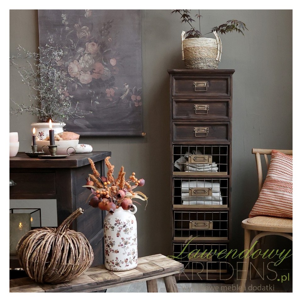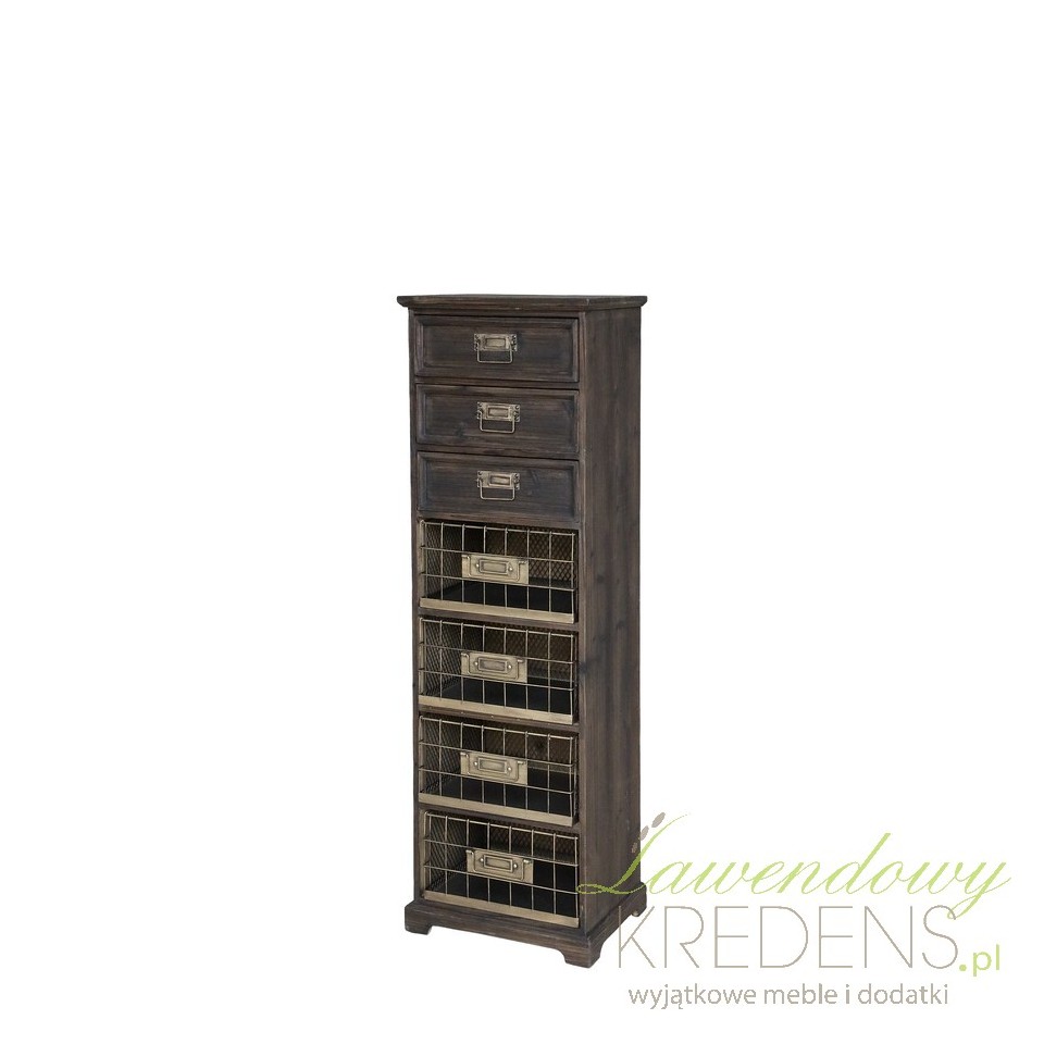 Wysoka szafka inspirowana starymi, aptekarskimi komodami, posiadająca aż 7 szuflad z czego trzy dolne to metalowe kosze. Szafka ma ciemnobrązowy, matowy kolor, a kosze posiadają miedziany odcień.