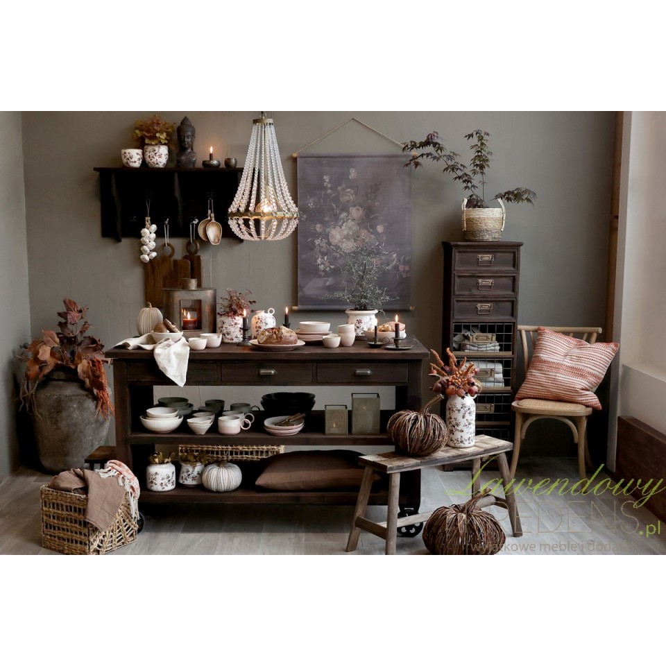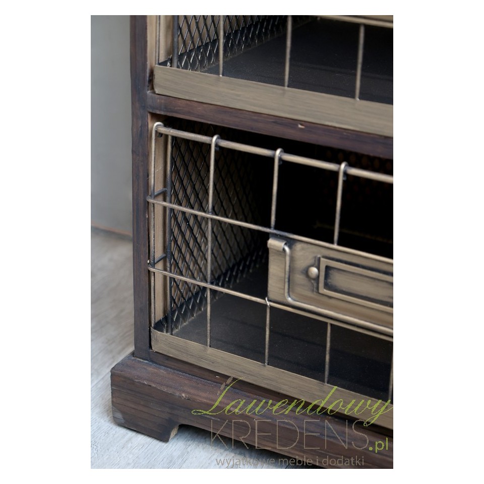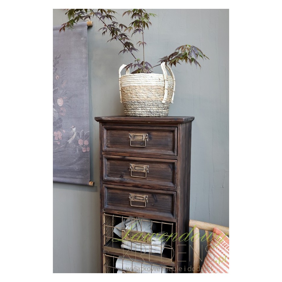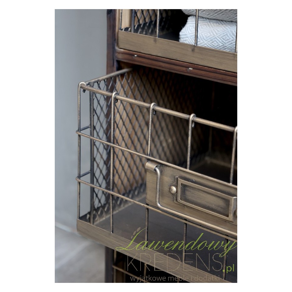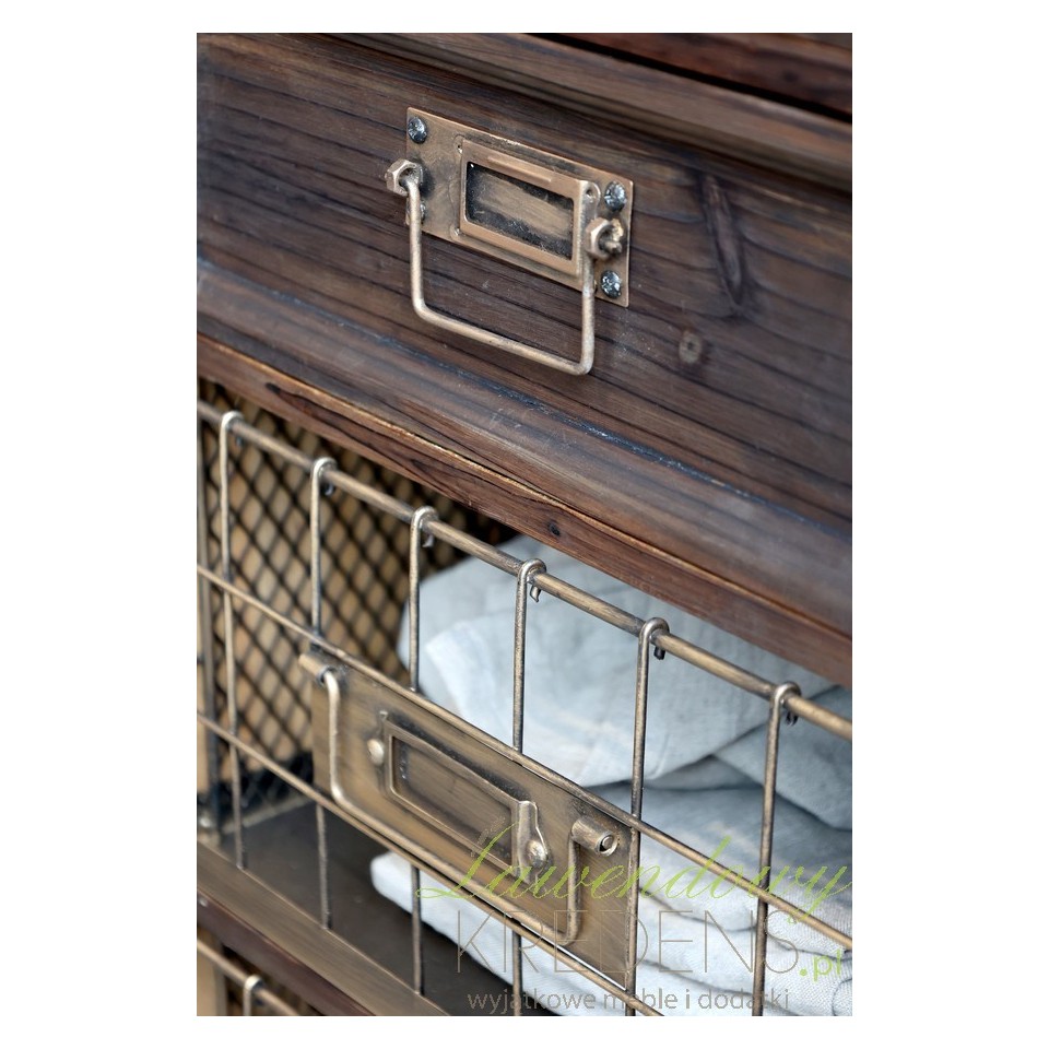 Górne trzy szuflady są wykonane z drewna, idealnie wkomponowane w całość z loftowymi uchwytami inspirowanymi komodami aptekarksimi. Cztery dolne szuflady posiadające takie same uchwyty to metalowe kosze wykonane z metalu w kolorze mosiądzu. Mają one ażurową strukturę, co dodaje industrialnego charakteru, ale jednocześnie świetnie współgra z ciepłem drewna. Te kosze nadają się idealnie do przechowywania większych, cięższych przedmiotów lub rzeczy, które wymagają przewiewu, jak tekstylia czy akcesoria. Kontrast między metalem a drewnem nadaje szafce niepowtarzalny charakter, łącząc styl vintage z nutą surowego industrialu.