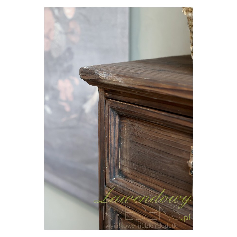 Ta ciemnobrązowa szafka w stylu vintage ma 139 cm wysokości i jest ciekawym, przyciągającym wzrok meblem. Jej ciemny, głęboki odcień brązu nadaje jej elegancji i klasycznego charakteru, idealnie pasującego do retro wystroju wnętrz. Szafka posiada siedem szuflad, które różnią się pod względem materiału.