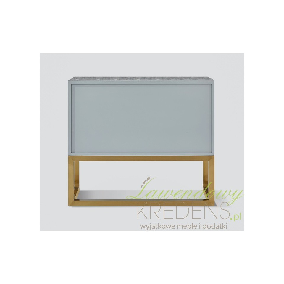 Wnętrze komody kryje przestronną półkę z możliwością przechowywania wielu domowych akcesoriów. Drzwi zamykają się cicho i płynnie dzięki zastosowaniu systemu soft close i zawiasów puszkowych. Mebel wykonano z wysokiej jakości MDF, forniru i metalu, co zapewnia trwałość i odporność na codzienne użytkowanie. Korpus opiera się na stabilnej ramie ze złotego metalu o prostokątnej formie.